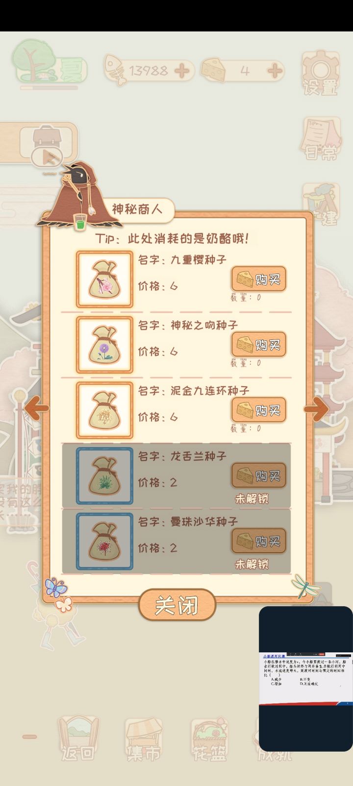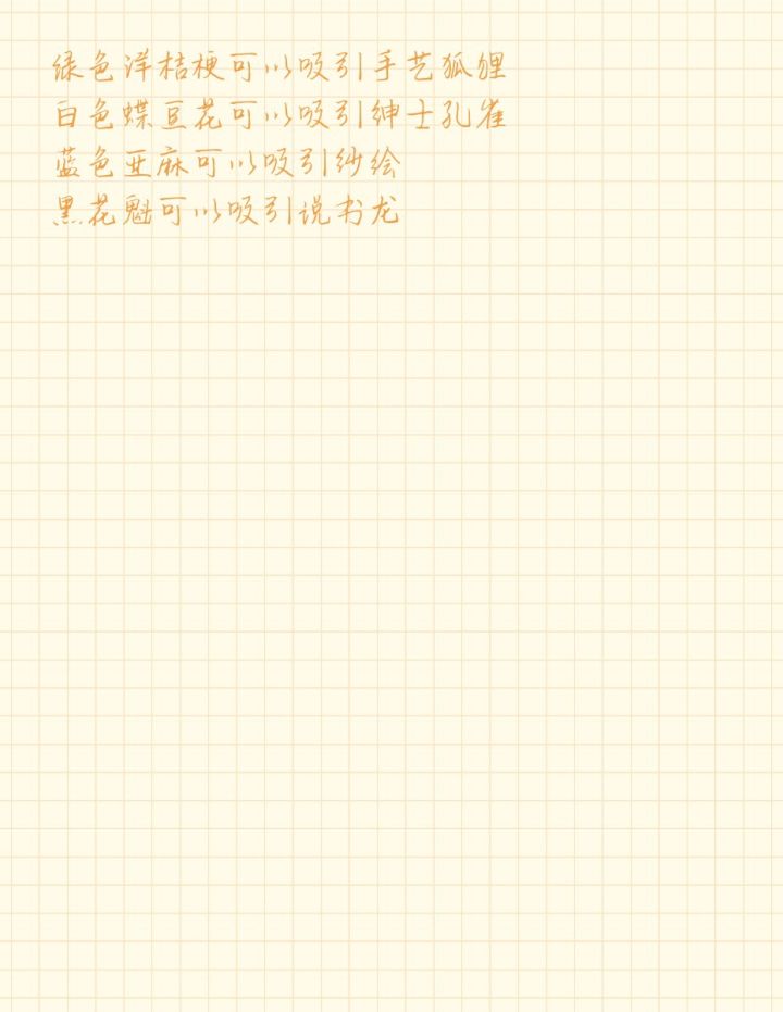 从神秘商人那里可以看到自己有哪些花没有解锁龙舌兰 曼珠沙华 黑玫瑰 昙花 金色鹤望兰 红色依米 依米 钻石玫瑰成就中改换田地十次是一个成就,后面有钱多改改我还差20个水泽木兰种子,种下去之后就能拿到水泽木兰种植一百次成就~说书先生的黑牡丹一直没有弄到加油,肝种植任务成就1,50,100花吐血整理针垫花橙黄色月季红玫瑰风信子紫色三色堇茉莉牡丹雏菊波斯菊紫丁香栀子花康乃馨水仙花梅富贵菊