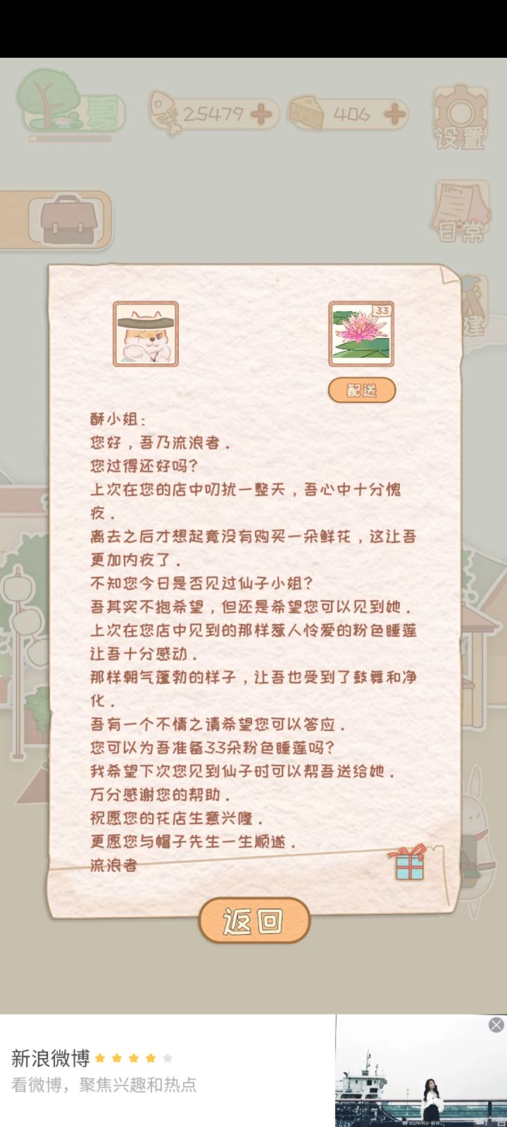 花店物语总卡,解锁了熊和警察狼的剧情,一个送了嘴唇花,另一个送的没看见,都卡没了,沙漠蓝铃花刚开始种了五个收获之后花篮里没有,用奶酪直接成熟后花篮里才出现,之后再收获就好了,这个bug有点多呀