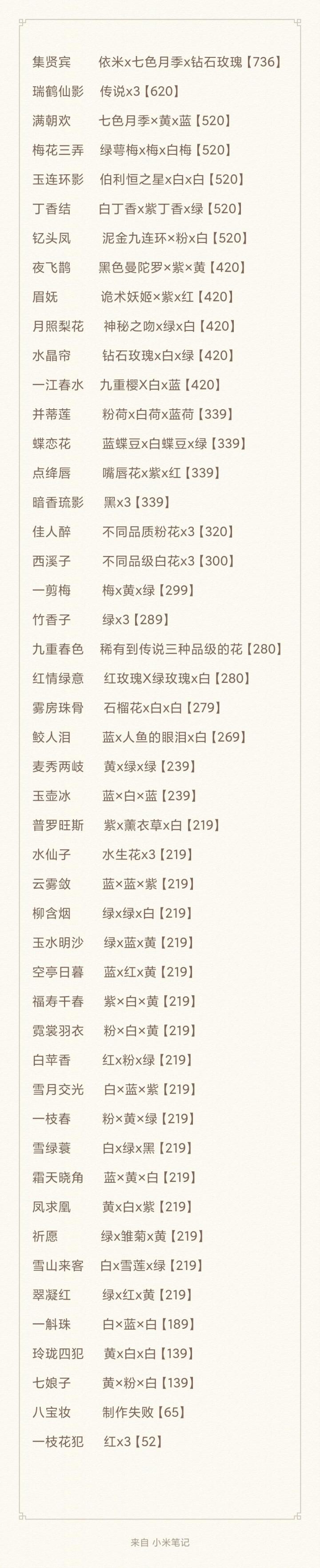 新的配方和价格来啦,有我还没收集到的呜呜,希望评论区小伙伴能补充下啦😺翠凝红 绿x红x黄=219雾房珠骨 石榴花x白x白=269鲛人泪 蓝x人鱼的眼泪x白=269(成本高)丁香结 白丁香x紫丁香x绿=520(这个超划算!)雪山来客 白x雪莲x绿(没有雪莲,不知道价格)普罗旺斯 紫x薰衣草x白=219(成本高)祈 愿 绿x雏菊x黄=219梅花三弄 绿萼梅x梅x白梅=520(没看清,好像是这么多…但成本巨高!!!!不值得…)