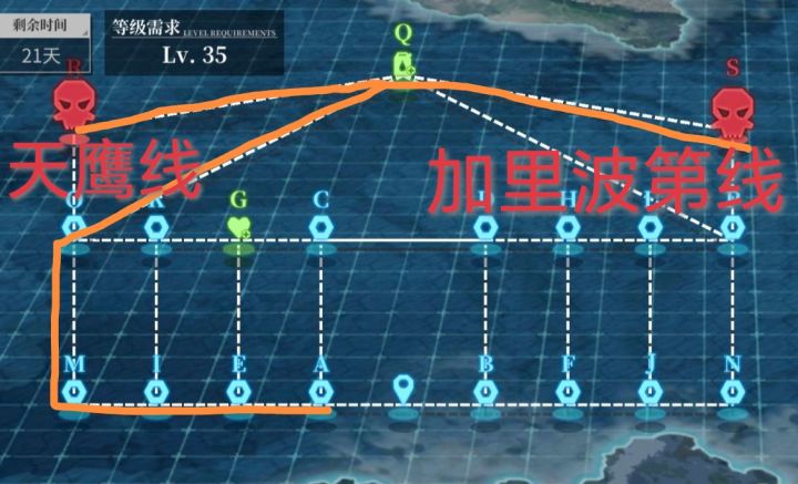 一套阵容通过改变一个旗舰就可以捞两个角色。新人没练度推荐把活动的两个船抽出来开加成打。两条线出战顺序都是111112。需要注意O到Q点要满足索敌>600,如果索敌不够又想走油点可以二队多上一个船凑够600索敌,或者可以先不吃油点,直接O到R先去捞天鹰顺便开槽,开完槽再去Q点。Q到R需要满足旗舰两个列加杜,两队加里波第和天鹰旗舰即可,Q到S把二队旗舰天鹰换给非列加杜。一队后排可以用哈曼杰维斯
