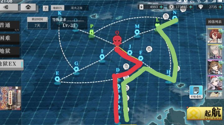 【花火之夜】Ex双点路线配队思路本期活动为游戏复活时的第一次捞船活动,有很多玩家没有捞满,本次复刻能很好的补齐星级,难度在现在来说在开了加成的情况下也没啥难度。Q点配置为:舰灵≥5,列加杜≥21队 卡约+应瑞 北上 旗舰卡约(战列)2队 波拉+阿瑞托莎 旗舰波拉(战列)出招顺序为2222211油耗为81*5+106*2=617油N点配置为:舰灵≥5,列加杜<2,旗舰战列=21队 威