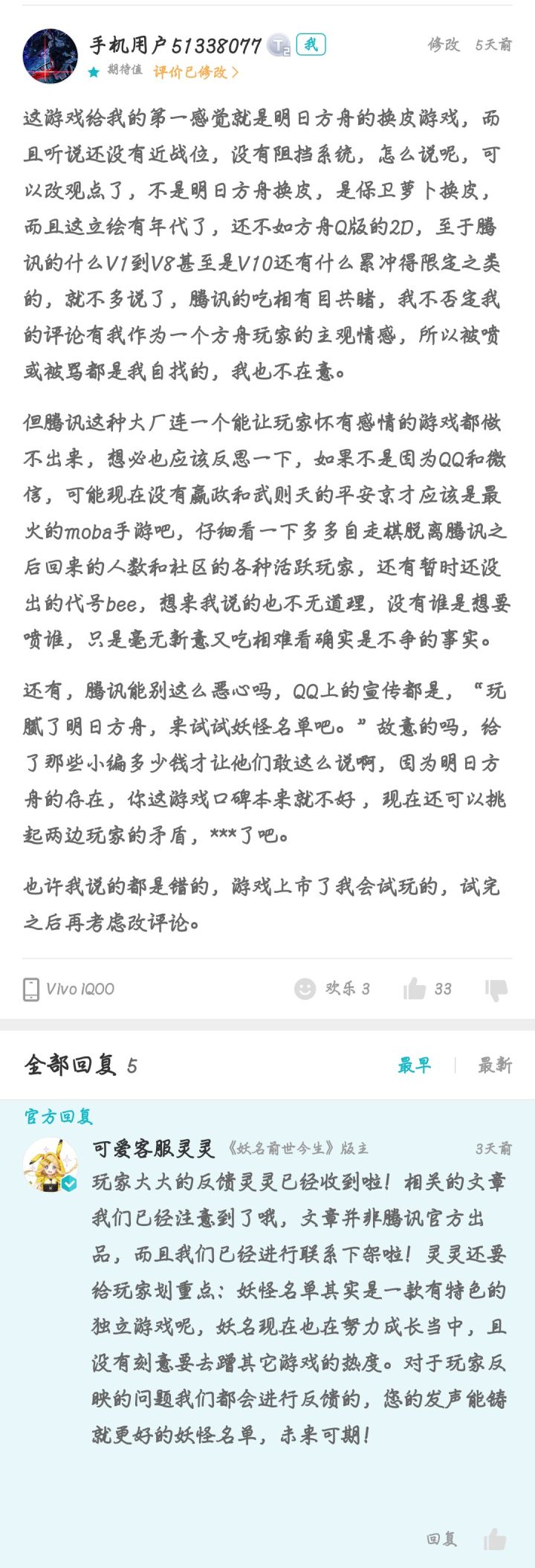 我曾经抱着很客观的态度看待这款游戏,有认真评价,一点点的分析,也很明确的指出过一些东西,客服回复了会处理好,这是当时的评论以及回复,然而就在今天我看到这一幕搞我呢?这有什么解释的必要吗?这游戏的风评以及在网上跟明日方舟的对比结果应该是很明显的吧,我没说错吧,就算真的觉得这游戏好,也不至于短短一个小时之内录这么多视频一个个发出来吧,很明显是有第三方设计好的,难道还没给钱?真觉得一个游戏的好坏是个