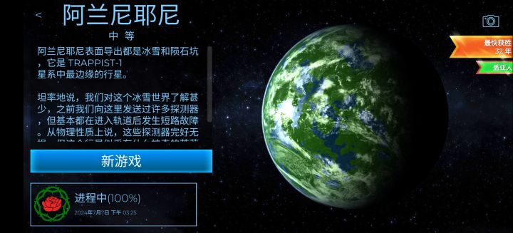 阿兰尼耶尼,难度系数中等,游戏刚开始星球表面上覆盖有230多万厘米的厚冰,这也是这个星球的最难点。这里建议的解决方法是:第1种直接将冰层的厚度控制到目标值56万;第2种比较简单粗暴,直接将所有的水处理干净,然后按照最原始的玩法加气压、加氧气,然后再加水......。另外,作为特拉比斯特星系星球之一,都是会受到外星母舰的攻击的,因此在游玩过程中难免会受到母舰的骚扰,不过我们可以给予反击,而且他每次的