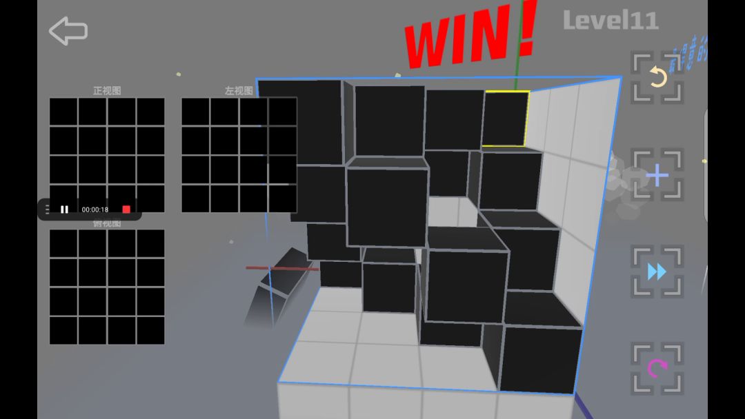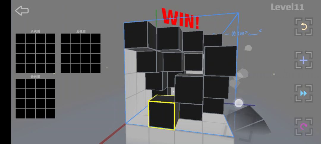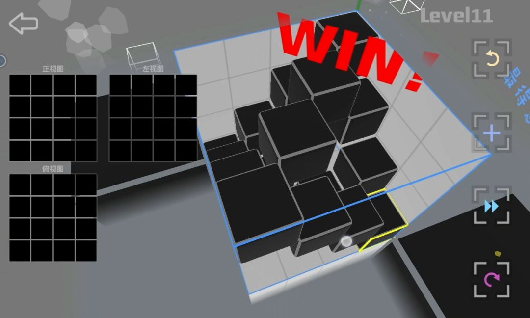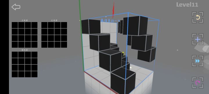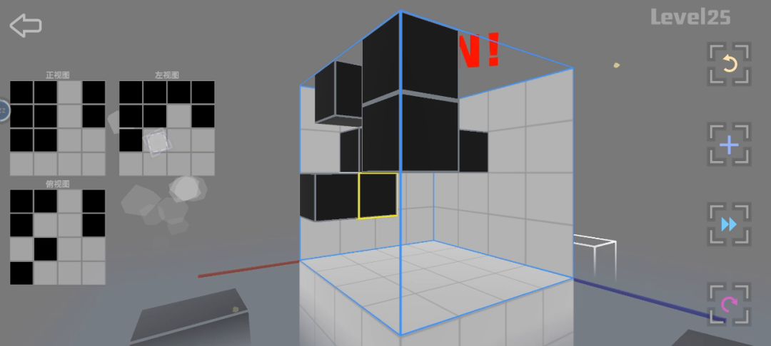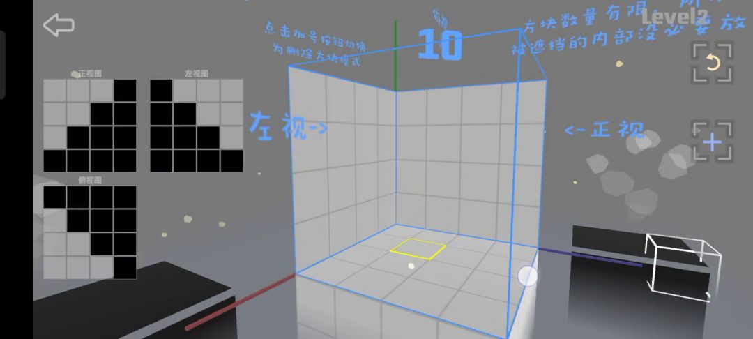 这四个方块简单地回答了“如何用最少的方块同时兼顾到三个面”思路:旋转游戏模型对着三个视图对比方块位置,确保每一个面用的方块数量是最少的。注意点不要遗漏一些被其他方块包裹遮掩的宝宝方块把它们拿掉具体步骤①首先,从正视图或左视图看起,因为它们两个图的对比参照性高点。我推荐依照关卡情况选方块最多的那个视图,然后把这个视图里的方块以行或列的方式隔开。举例:选正视图,以行的形式