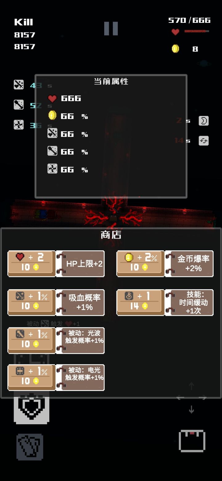 先来个满属性(血量没有满 1000血都不满 估计没上限)关于伤害增加:一开始被怪攻击掉1血 随着积分增加最高伤害5刷到10000的时候开始 挂机送死...观察了一下 似乎才4的伤害啊...... 技能、状态说明(来一张全状态的)被动(左边上面三个小图标):杀深蓝色怪 概率 随机给一个 重复获得刷新持续时间(60″)1. 回血:简单明了不解释 我觉得首要升级的技能 活着 才是真理!!2