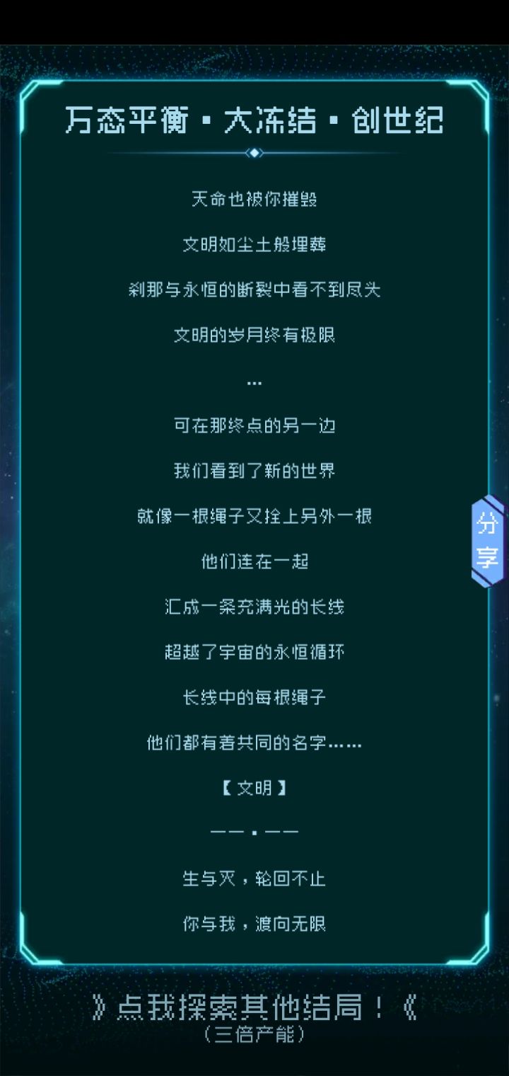 创世纪路线攻略(萌新第一次发帖不喜勿喷QAQ)创世纪是我最喜欢的结局了吧,就挺感动的(具体不剧透了)具体达成方式:九个星球全共生,五号星球选机械嬗变(机械嬗变属于比较高级的共生)注:机械嬗变在五号星球和逐光的对话里选择投放技术才会出现在大抉择里!!!看门人要打死,星翰协议、共联世界、守望者别打是友军啊喂(追光者随意,要是想要成就可以不打,但有必要提一下他们是没良心的菌类,不要指望你帮了它们它们就报恩(╯‵□′)╯︵┴─┴)最后到白洞选择对冲就好啦