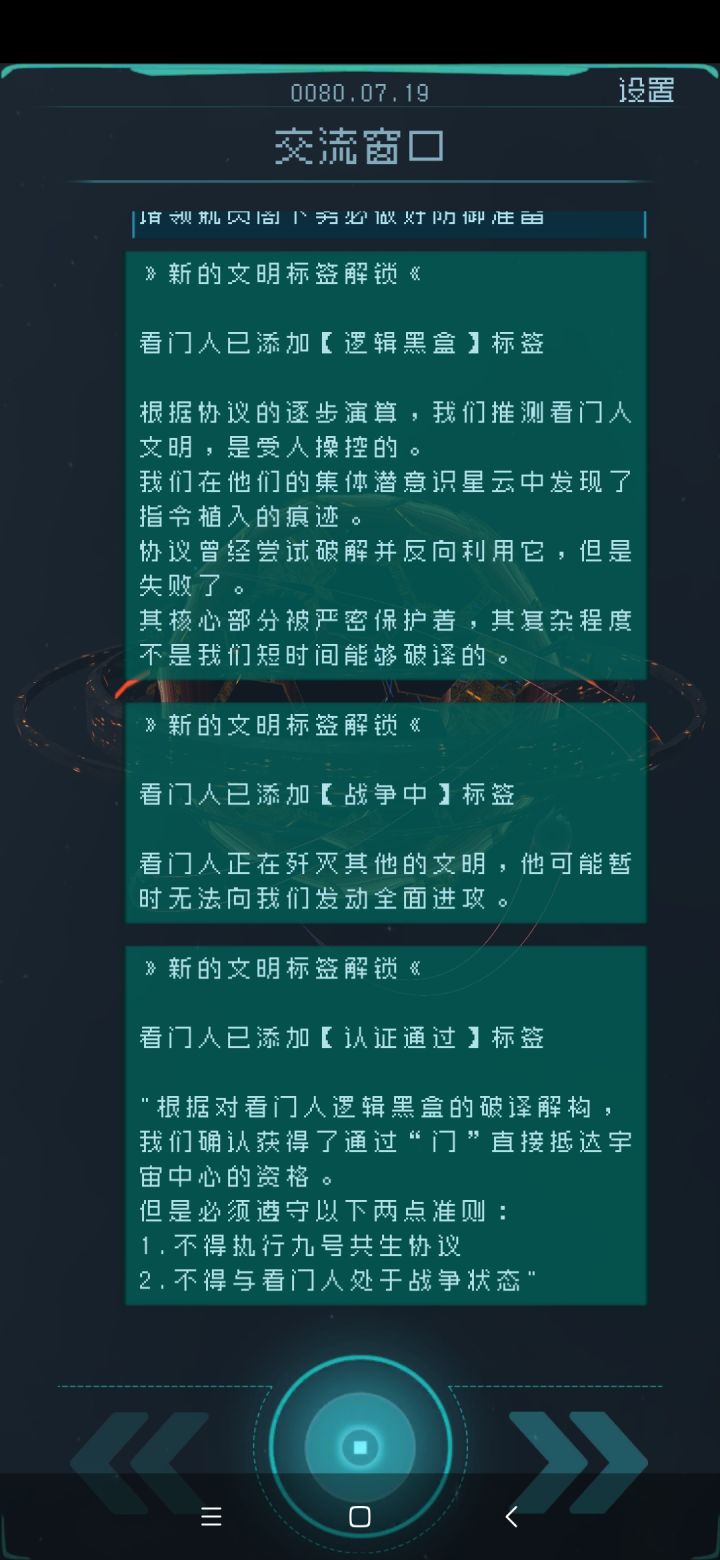 本帖是一个有关《逐光:起航》游戏基本知识的帖子(基于官方版本,进行了补充和优化,有轻微剧透)不讨论道德问题和大抉择如有错误、缺漏,欢迎指正和补充———————————————————Q:这是一款什么类型的游戏?A:这是一款你来决定整个文明兴衰存亡的游戏。游戏背景依托于著名的“宇宙大撕裂假说”,讲述了许多文明在宇宙末日来临前夕,挣扎求存的故事。你将作为一艘超科技飞船“空想级MKIII”方