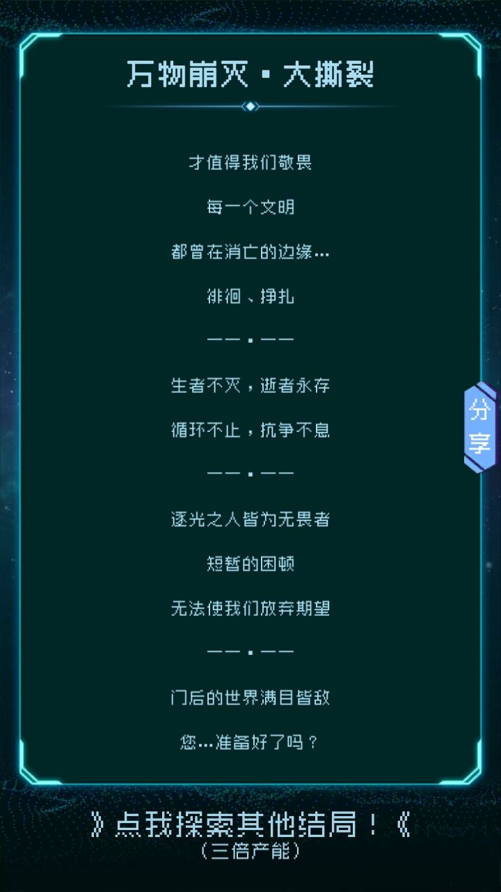 第一次玩是挺久之前了,我把这款游戏当做策略手游,对于各种文明的存亡,完全是看心情,后来也成功达成创世纪成就。往回一看,七成都是共生😂😂现在又回来看了一眼,这标签居然是剧情!着实给我惊了。现在重玩一次,的确也没错,各个文明的剧情都很全面,我随手的一个按键,就决定了一个文明的存亡。然后,越来越舍不得吞噬了。至少原来的废土没有价值给吞了,但现在有点下不了手。说不定从七成变成全部了?😅