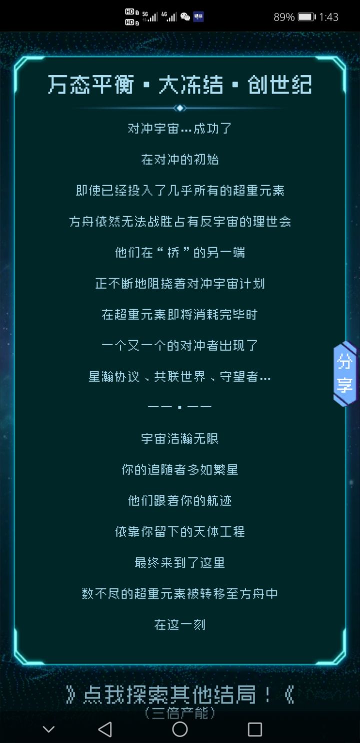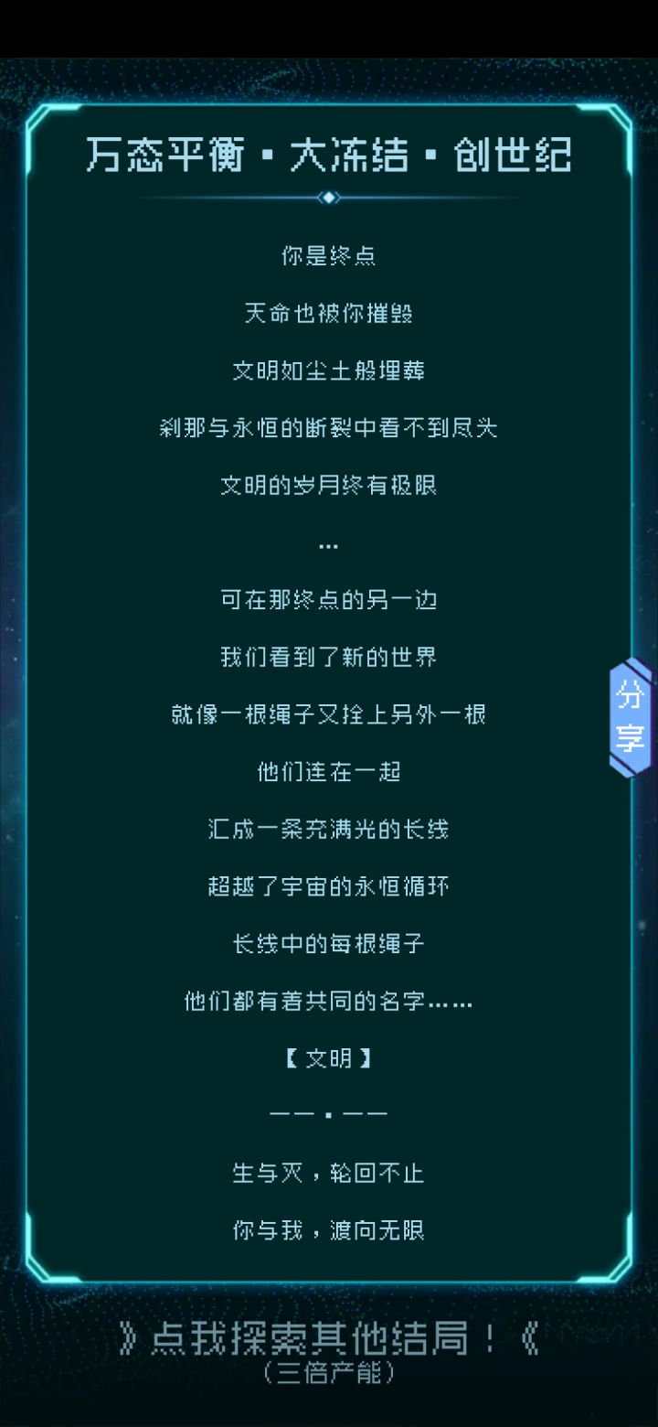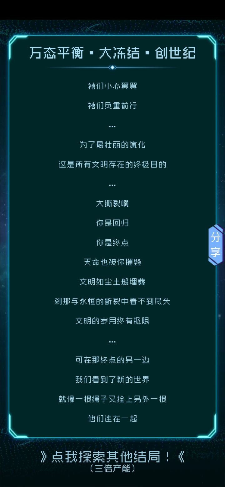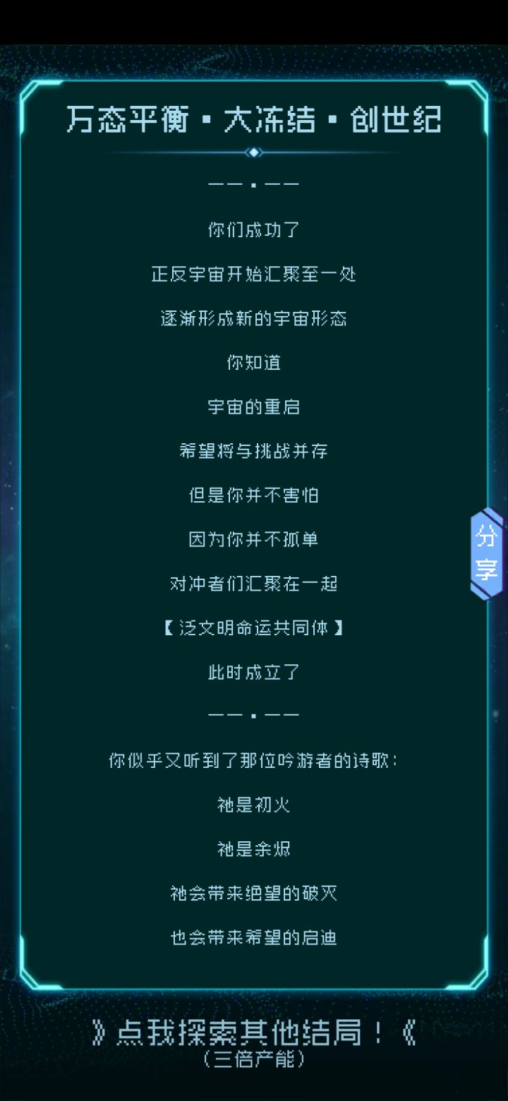 怀着对所有文明的爱,一周目我选择了123全共生,4蝉变,后面全共生,杀了一个打我的,满怀信心对冲,大撕裂。哭了。我是蓝星的罪人😭第二次觉得是能量不够,收割了没人的星球,还是输了。😭