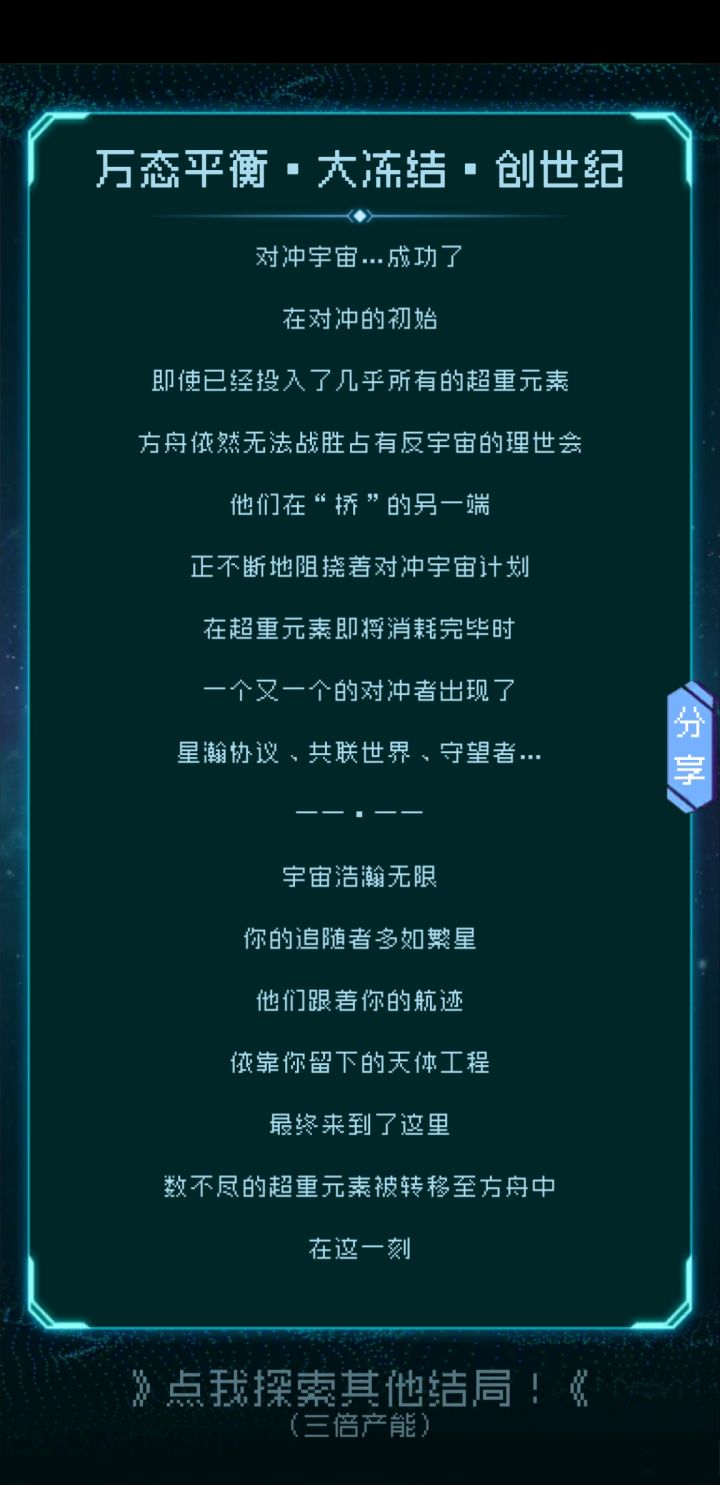 玩了好几天终于结局了 没看任何攻略玩的 第一个废土星球我看逐光说共生价值底我就收割了 后面几个我都共生 毕竟星球还有生命或者说共生能给其他星球留下希望 我就共生了 我也不知道这个对冲结局是不是大家都一样 感觉特别震撼