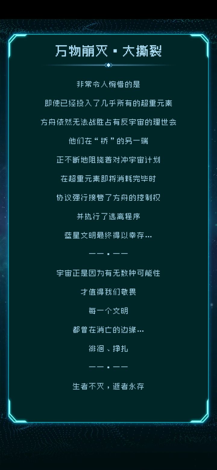 这一年,马上要过去了。这一年的各种事件。注定使这一年不平凡,方舟的起航使大量的领航员决定了另一个世界的命运①。计算机终端突现的病毒②,我们挺过去了。我们逃离的,冒险对冲的,都得到了好的结局③。在新的一年里,我们,必将创造更多的结局!必将,让更多的世界线,得到好的结局④!我们盼望着,盼望着总有一天,无数的方舟和领航员⑤,能在某处相遇⑥。——领航员■■■⑦亲启——注释—