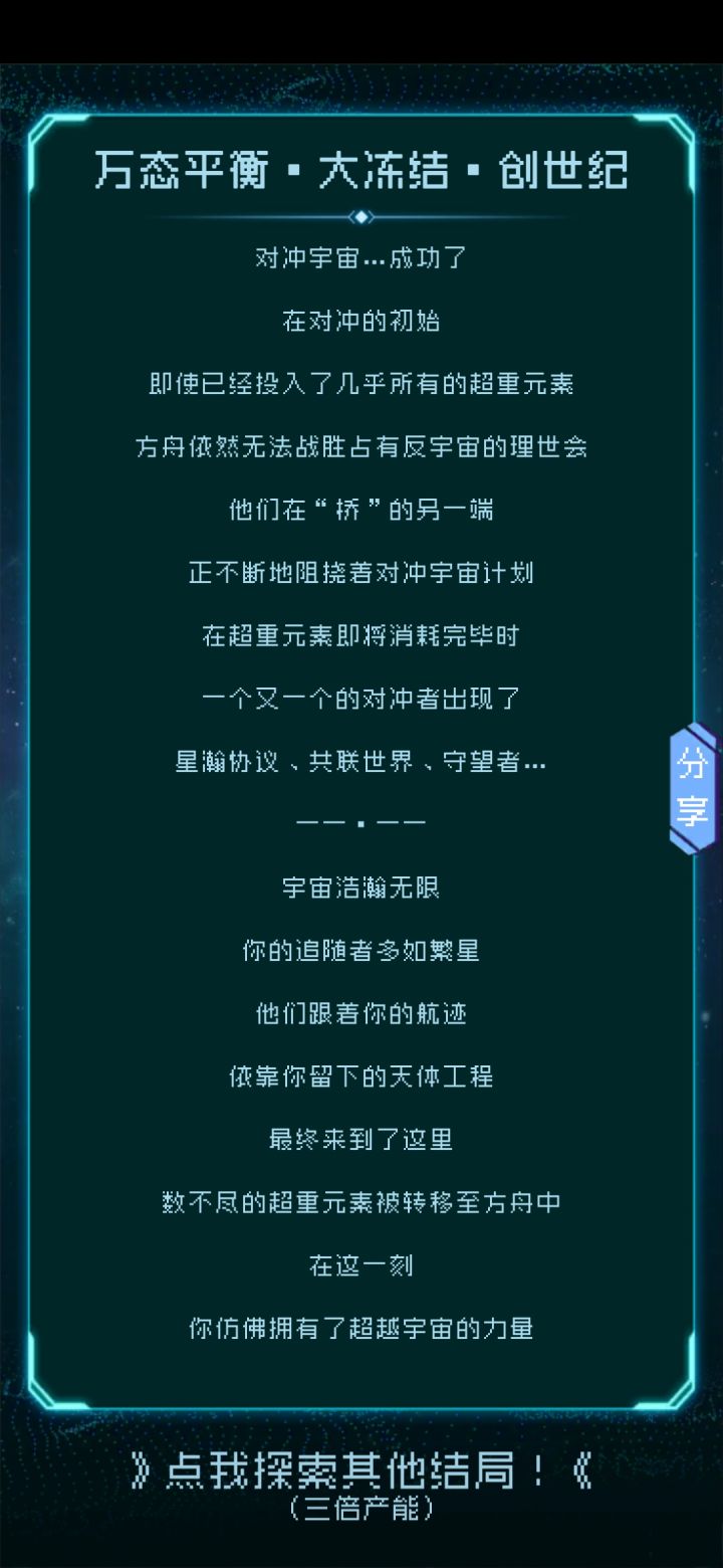 我来拉低中奖率了😼话虽如此,但还是想要中奖的。另外,马上就到新的一年了,祝大家新年快乐,新的一年希望大家幸福快乐,欧气爆棚。游戏做的很好,画质特效都很符合我的审美,就是希望能出一个结局收集的界面,不然每次打完一个结局都要截图记录,有时候忘记截图后悔死。已经通关两次了,两个都是对冲,一个是有的共生有的收割,对冲失败,第二次是听了大佬说全收割对冲必成功的教导,全收割,对冲成功。现在三周目,算个萌新了。