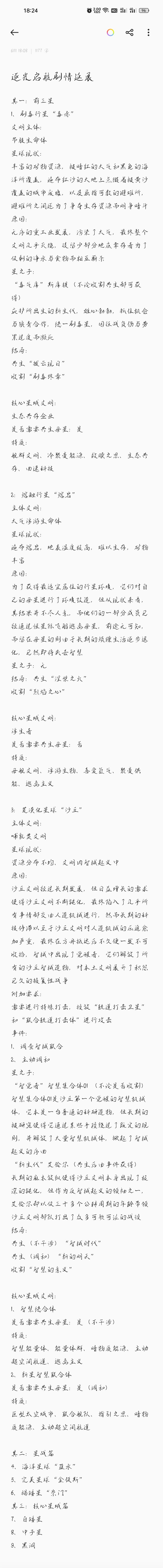 今年有大考,明年暑假继续😓 序 蓝星历173年,方舟路过一颗星球,放下机器,一道道星环升起。 机械的声音响起:“领航员,又是大抉择的时刻了。” 驾驶舱内一名蓝星人,望向窗外:“这被植物所覆盖的星球少的可怜,我选择共生。” 庞大的星环开始运转,不断地改善着星球的气候。 方舟投放下了一块生物质,它开始蠕动,生出了眼睛,凝望着星环。 远处光芒闪烁,空间常数开始了扭曲…… 感谢@静的催更