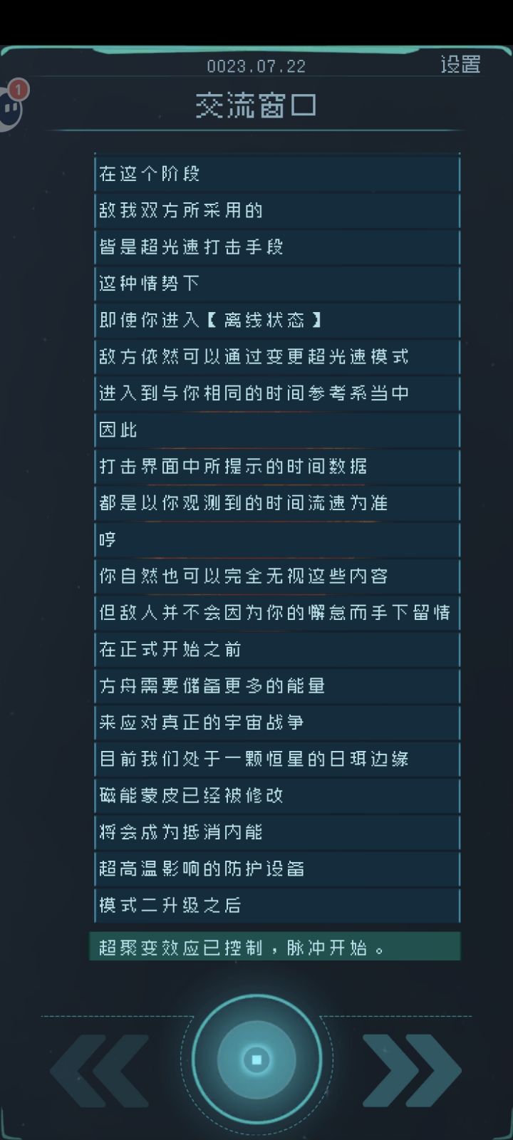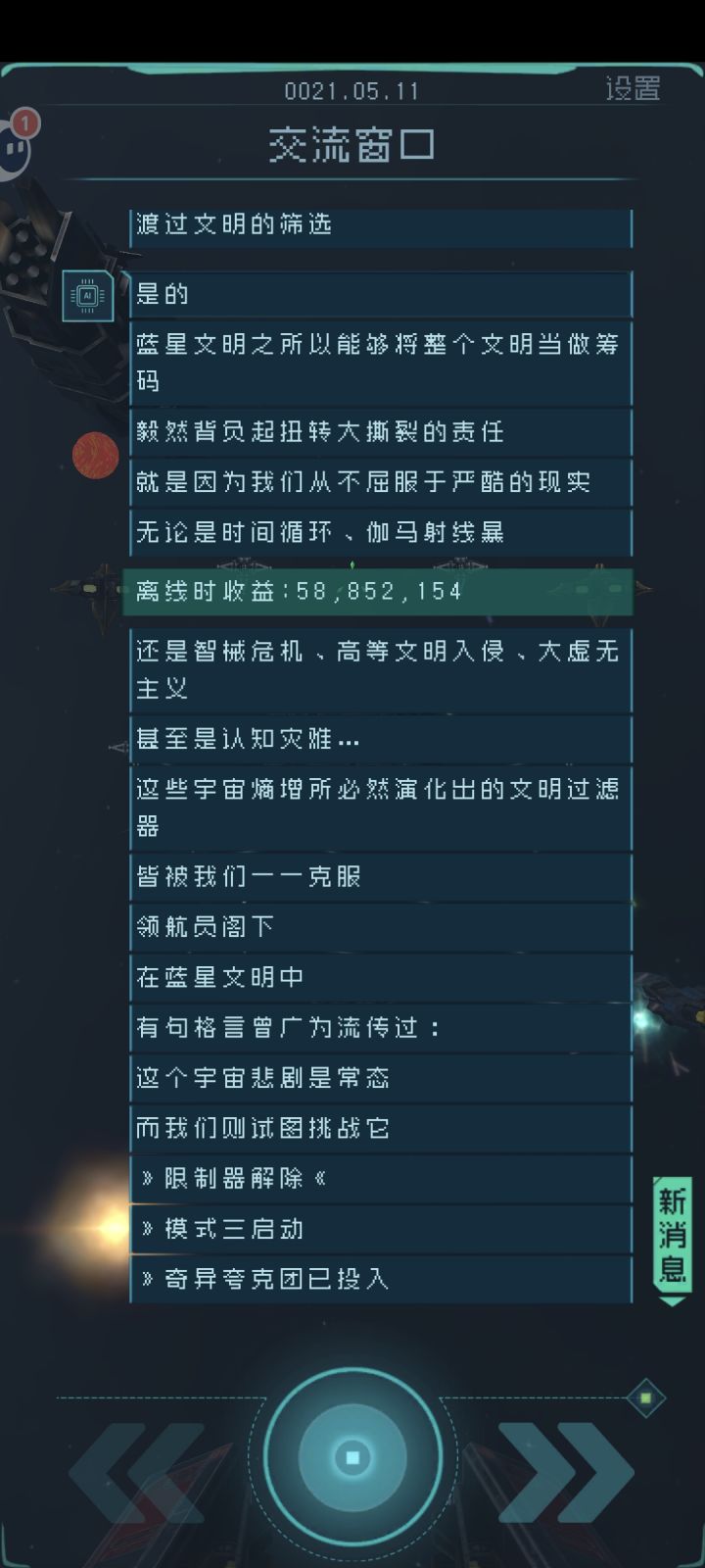 该文明只有在领航员部分共生(重要文明不打击、奇点降临、机械嬗变)的情况下在第九星出现。》新的文明《》已发现:233文明----------------------------------------------》新的文明标签已解锁[星舰文明]该文明依靠一个小型星际舰队前进,大约有100艘星舰。其星舰的技术水平甚至略高于蓝星文明。威胁度:50%--------------------