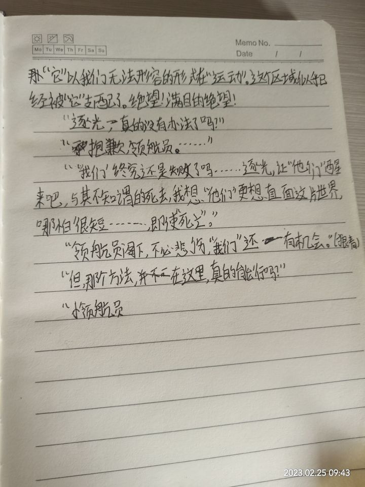 领航员缓缓打开舱门,减压后顺势飘了出去,右手落在头盔开口处,“嘶…”一声绵延响起。方舟内传来了两位执掌模块的惊呼声。“宇宙…是残酷的…”领航员终将拿下头盔,一朵血与肉之花盛开在太空,血液很快凝聚成冰晶,反射着恒星的光芒…领航员自主意识故障重载中…重载完成祝领航员航行无阻祝领航员航行无阻祝领航员航行无阻