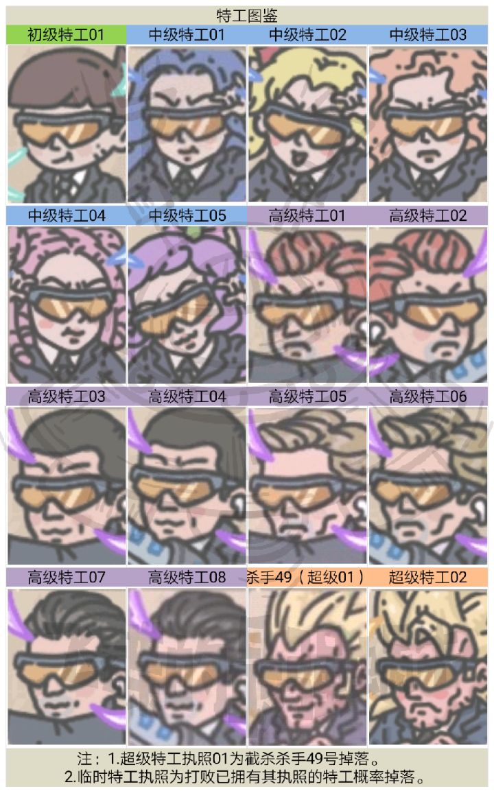 相信各位小伙伴们快被乱七八糟的特工执照搞得烦死了,都不知道自己缺的执照怎么拿。莫慌,现在给大家带来全网最全特工执照获取攻略!先来张图给大家压压惊,认识一下各位特工。特工执照分为两种,一种是正式执照(后面带编号),一种是临时执照。一、正式执照正式执照是击败不同形象的特工掉落(超级特工执照01除外),在碰到特工事件时,选择AA即可(一定要打过ta才行哦,打不过什么都拿不到)。下面奉上正式执照信