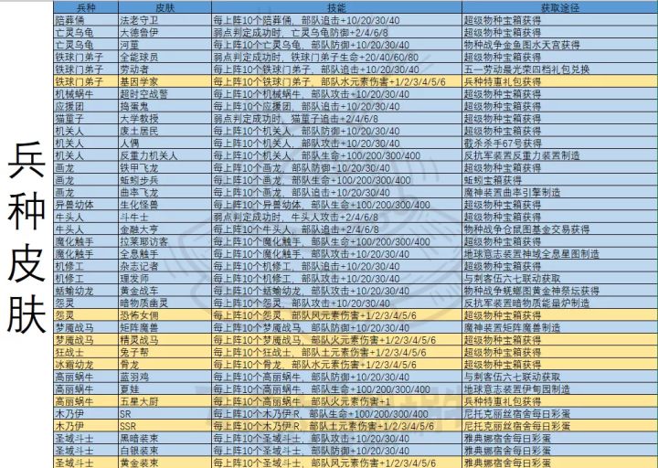 本文出自UFO攻略组,有需要的小伙伴可细品!更多攻略请关注微信公众号:飞碟的最强蜗牛今天为大家来整理一下兵种皮肤~话不多说,冲冲冲!!1.本表大顺序是按照物种战争宝箱皮肤顺序,其次是按照蓝在上,橙在下顺序,最后是同一兵种皮肤推出时间顺序。2.涵盖了目前所有出现过所有的兵种皮肤。不难从表中看出,橙色皮肤所加成的都是元素伤害,效果远大于蓝色皮肤的加成,因此,有橙色皮肤就应当升级橙色皮肤,那