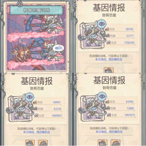 前言:今天果妹给大家带来骸骨恶魔试炼,因为新增的试炼太多,果妹无法一次性全部讲完,所以每期零零碎碎的给大家讲解一下!为了方便大家阅读果妹做了一个基因模拟汇总表,杀手也有!!!果妹要一视同仁~好了话不多说我们步入正题!地缝2000层的时候地缝商店会刷新骸骨恶魔基因片段,购买需要500古代货币想要提交样本进行深度分析我们需要凑齐5个骸骨恶魔基因片段,才能解锁骸骨恶魔试炼,骸骨恶魔试炼限定形态是恶