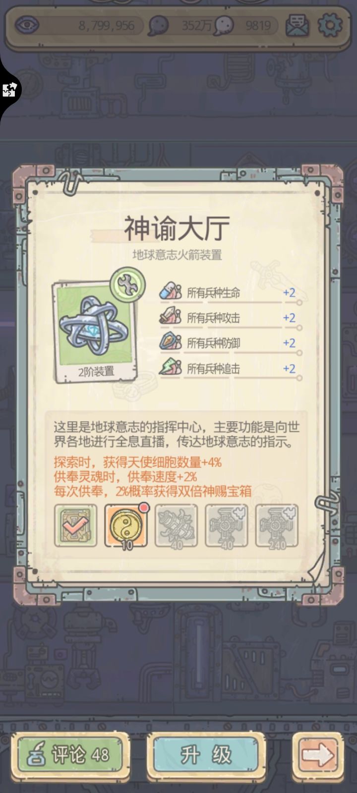 关键橙列表(对进程影响大的,欢迎大佬指正,排名不分先后,“阶”就是贵重星数):1.望远镜(五阶及以下都可换,但是平民小氪不用急,放置游戏嘛,数值都上来了缺进度再换)2.普罗米修斯火炬(四阶及以下至少换一次)3.黄金麦穗(中前期缺黑蝌蚪,最优加成贵重)4.雅典娜神像(除了基因模拟加成外,神赐宝箱加成也很香)5.凤凰的羽毛(没有巨龙五就不急)6.司母戊鼎(四阶及以下至少换一次)7.奥斯帕