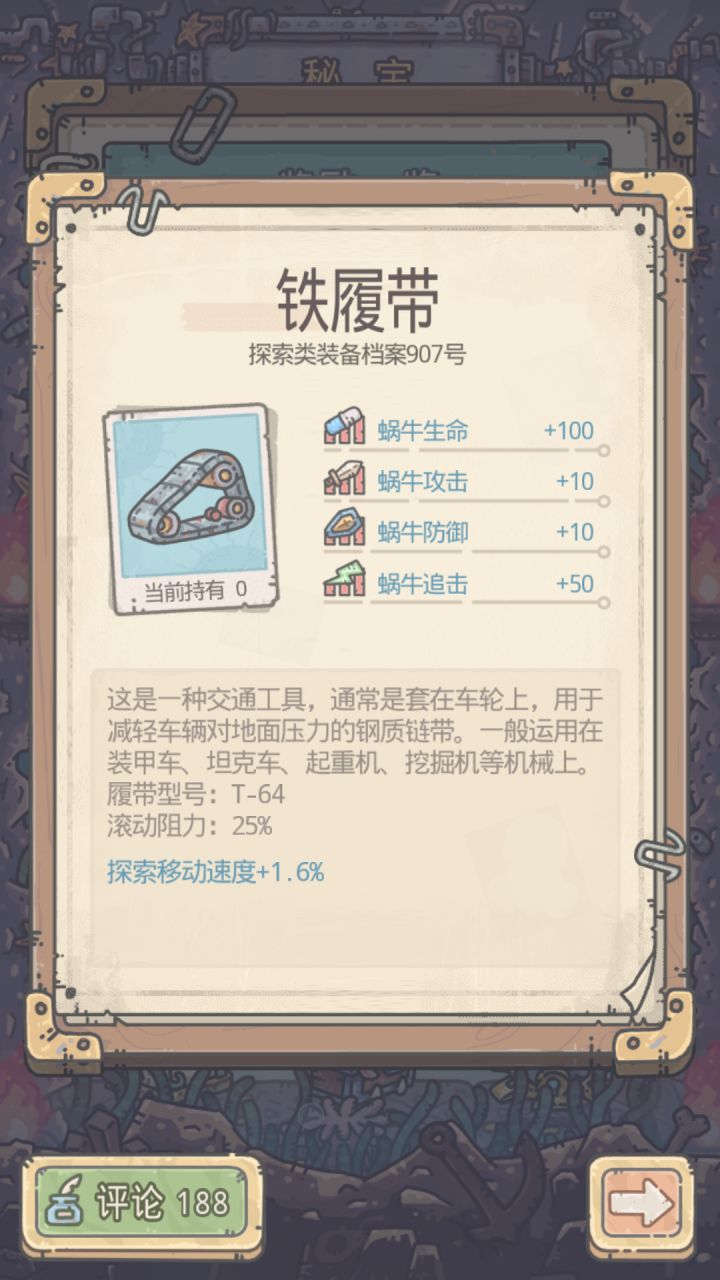 第一件,铁履带想必看到这,大家都心知肚明了吧。没错,这装备效果就是探索是加速1.6%!!!而红装后它的效果是探索时加速9.6%!!!(由于小编非酋,没有此神物,所以红装图缺)第二件,坚固圆盾如图所示,此装备效果为伤害减免1.6%!这是什么概念呢,就是让你受的伤害减少1.6%!!注意,是所有伤害。所以当有小伙伴欧气抽到这个装备时,不要冷落了哟。红装效果是伤害减免9.6%!!!简直就是坦克必备啊
