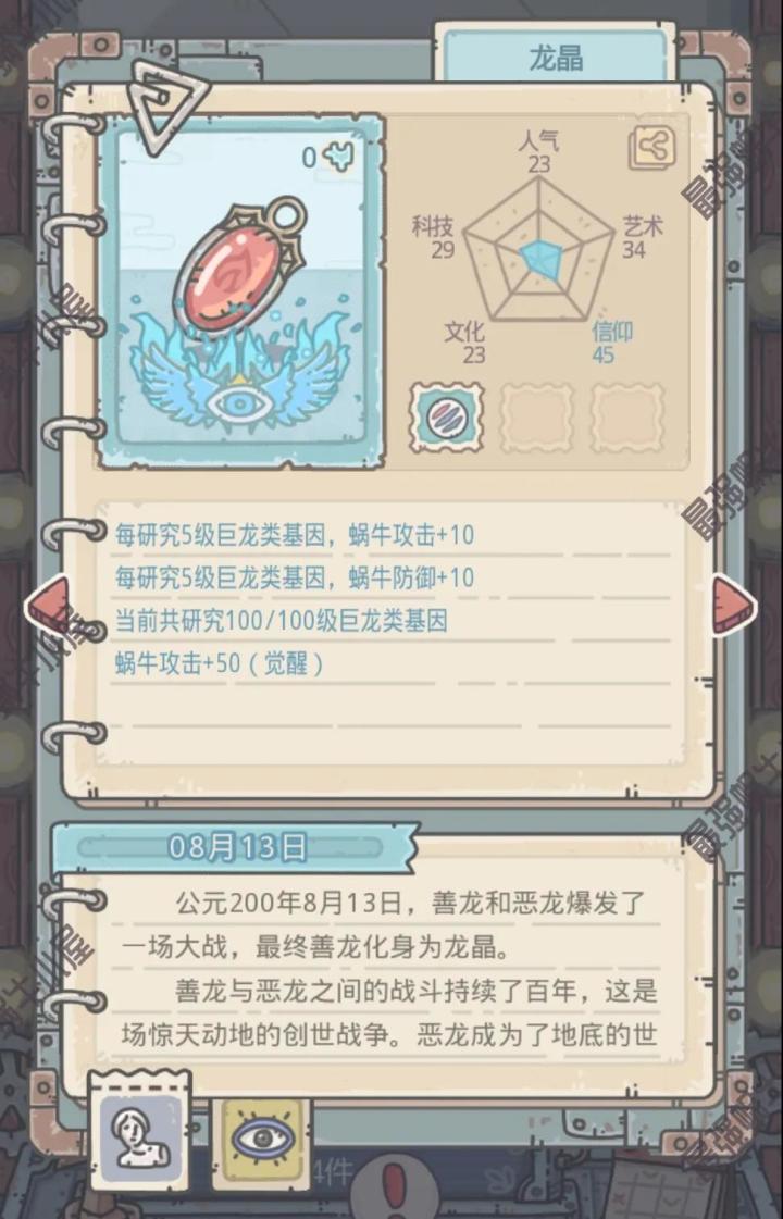 小编看到有很多人都在问巨龙形态的获取途径,巨龙需要所有的其他形态都到达5阶,然后去买一个回馈礼包开启。下面来具体介绍一下巨龙形态的特点。01阶巨龙基因完成后,龙珠时间减少1小时。02阶巨龙基因完成后,给20个龙晶的碎片:研究巨龙基因100级后,可+200攻击、+200防御;技能为高丽博物馆改造,置于高丽博物馆,赋予探索效果为蜗牛防御+20。觉醒后蜗牛攻击+50。03阶巨龙基因完成后,