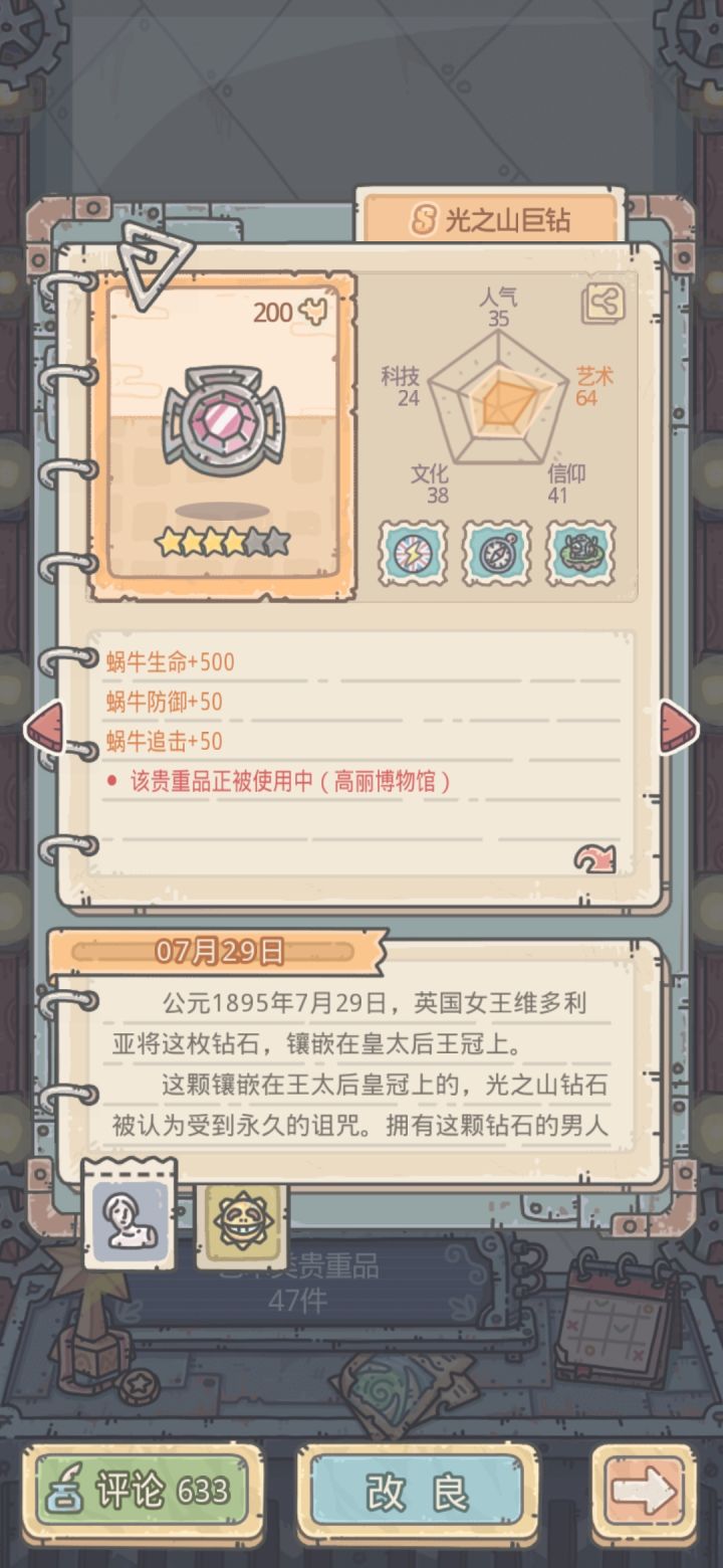 我今天想明白一个道理。对于上了s级的博物馆来说,1170分和1799分没什么区别,所以在保证s评级的基础上,完全可以这么玩。这是我的米国博物馆,我把我所有在米国博物馆生效的橙紫贵全装上了,很多都乱装的,比如说米国博物馆技能橙贵很多都是人气的,但人气格子不够,我就塞在信仰里。只要有技能就行了。