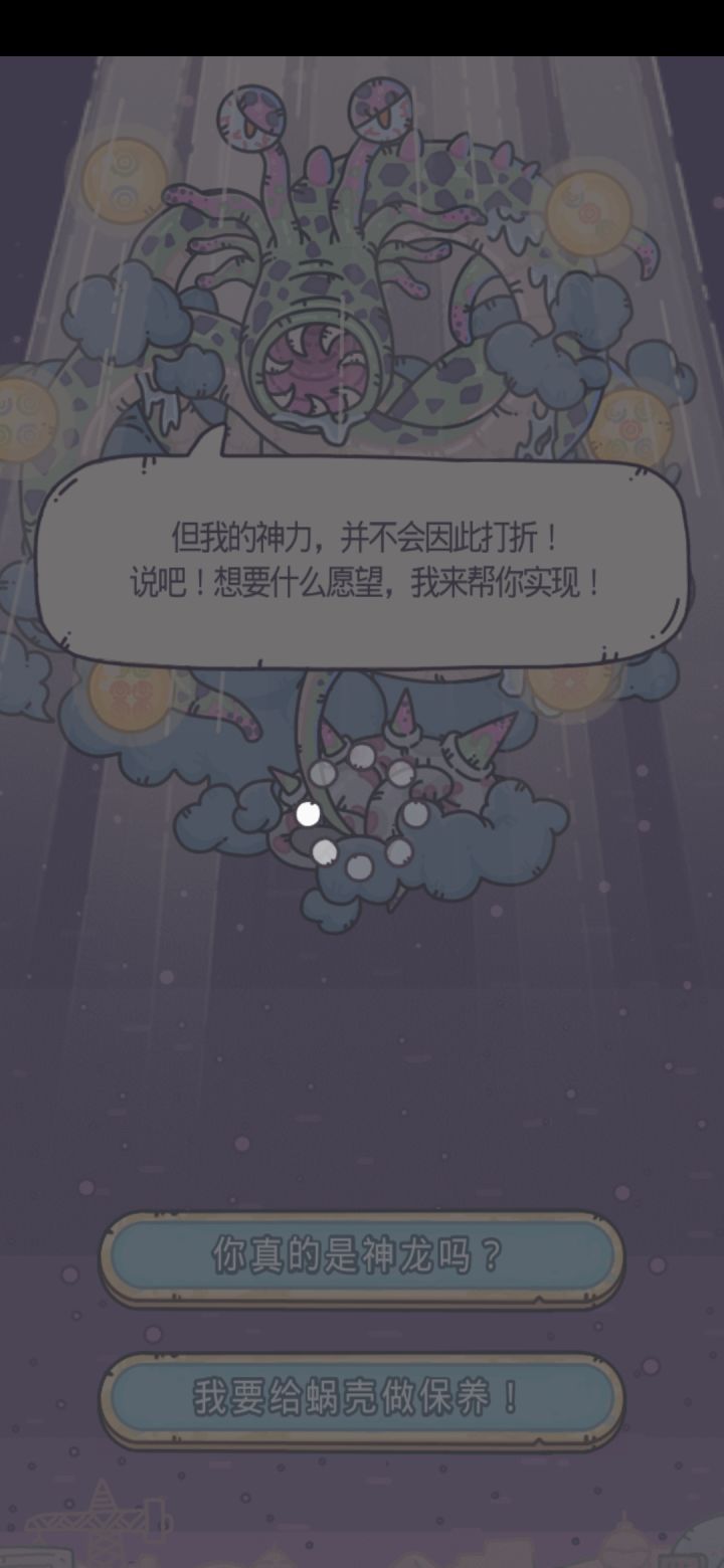 之前许愿遇到这个然后发现给蜗牛壳做保养的选项没见过,求助也没人回答,所以我选了并记录了下来。解锁蜗牛壳升级的功能,我说以前那些蜗牛壳涂料怎么用,原来还要许愿解锁……