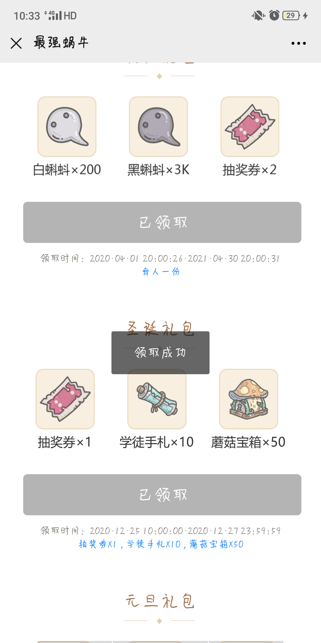 游戏内并没有收到邮件 返回再进礼包界面又能领(青瓷公众号也有蚊子腿)只是说游戏里没收到而已尽快修复吧 我也不是贪这么点小东西 节日嘛