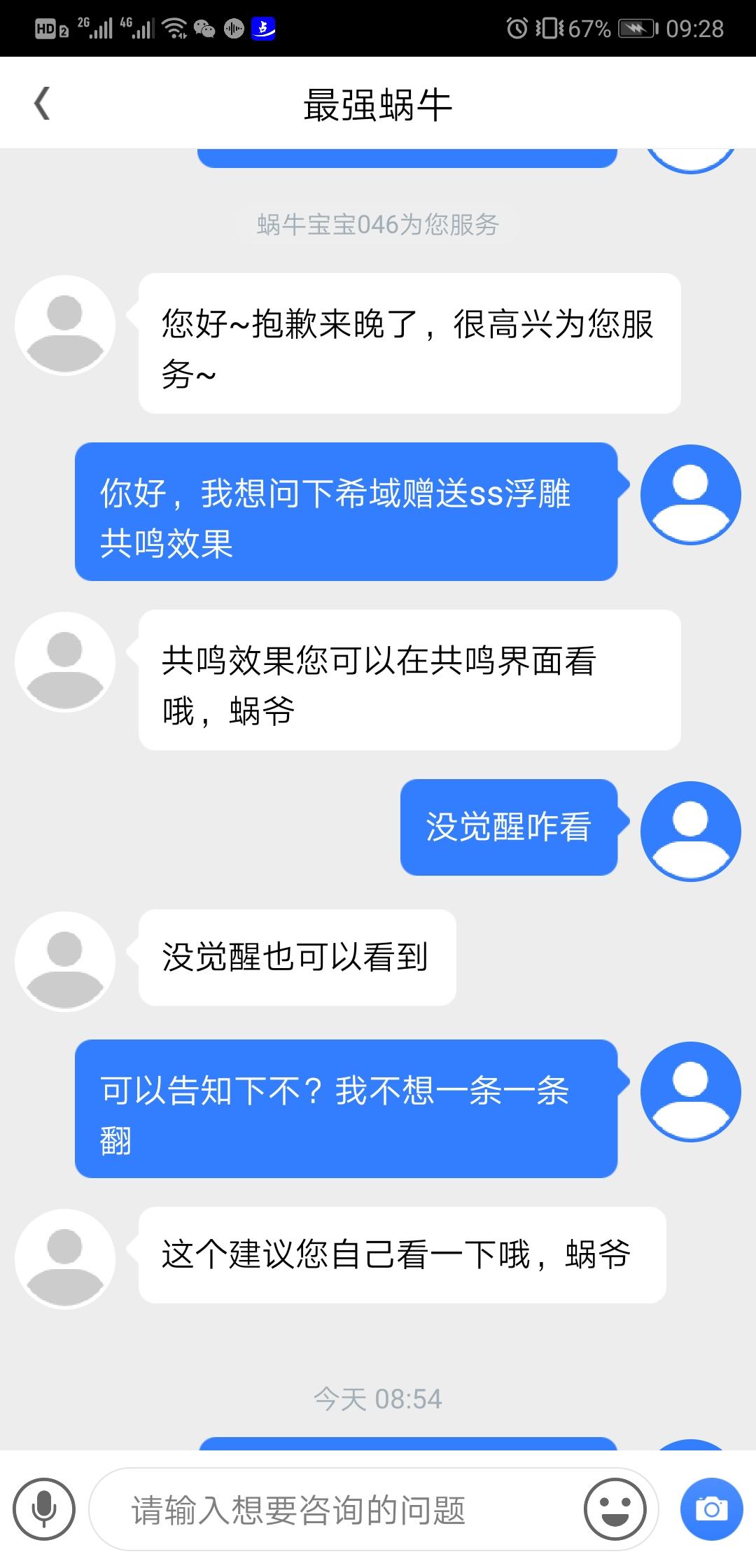 问个游戏内的问题,客服回复就让自己去查,这也就算了,最尼玛离谱的是,换了一个客服问,人家回复说这贵重共鸣效果未实装,这让咋查?衷心希望大家别遇到46号客服。最后上个战力图免云,请大家注意之后遇到这类型客服直接投诉,然后再换客服问。