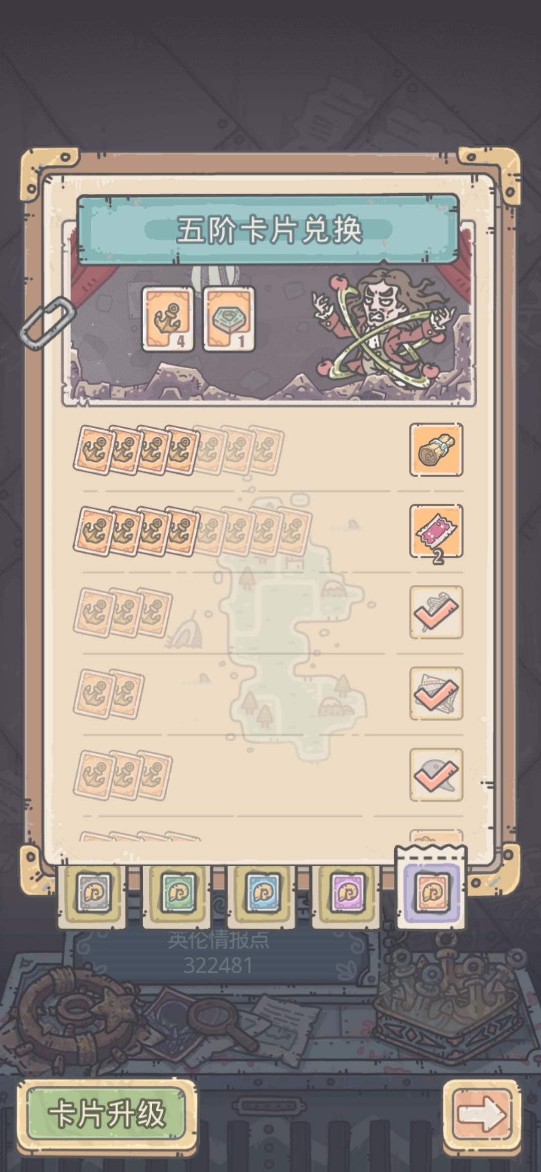 目前进度卡在英伦亚瑟王喽啰兰洛斯特处半个月了,船为满级2橙2紫1蓝,现在根本过不去,现在英伦船的炮击是伤害大头,而加强炮击紫船和装备英帝国头盔因为英伦情报私掠许可证的原因难以获得相应数量得船锚卡片,所以希望私掠许可证的效果能进行更改获得更多的英伦船锚卡片,没点私掠许可证的千万别点