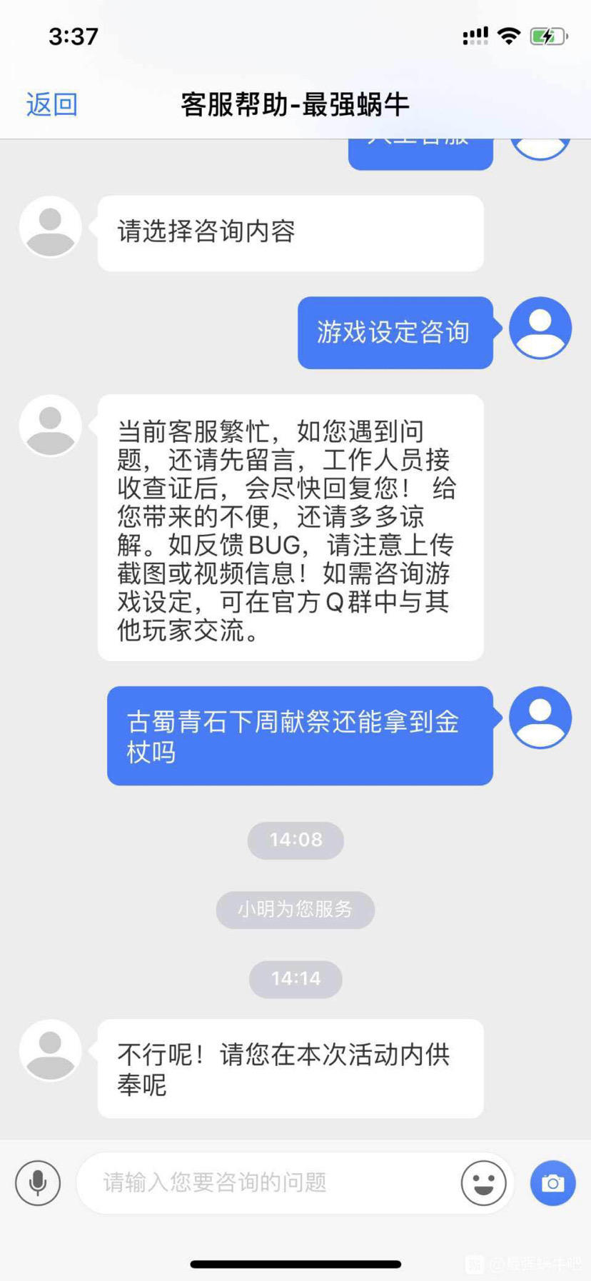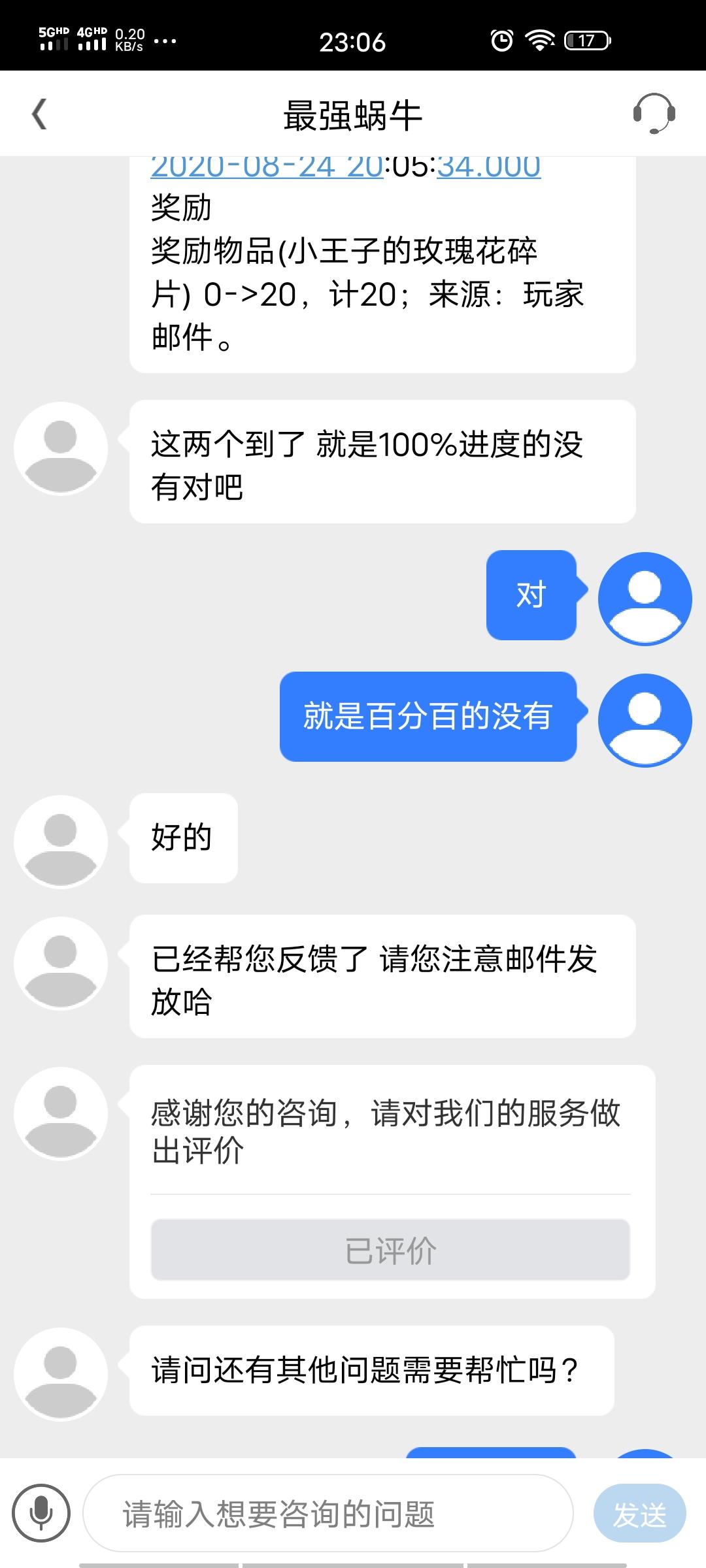 忍一步越想越气,我没有关注鹊桥活动的截止时间,今天早上点到百分百了,然后没有邮件,我就跑去问客服,客服说会给我。然后我就期待着。然后客服下午联系我说活动到期了,不给了,意思你个铁憨憨自己误了点还想白嫖?wtf?你自己活动入口不关,界面不结算,客服告诉我还能收礼包。现在又说没有了,耍我玩呢?仨瓜俩枣不算啥,被告知全是我的责任,被当傻子玩,我很不爽。