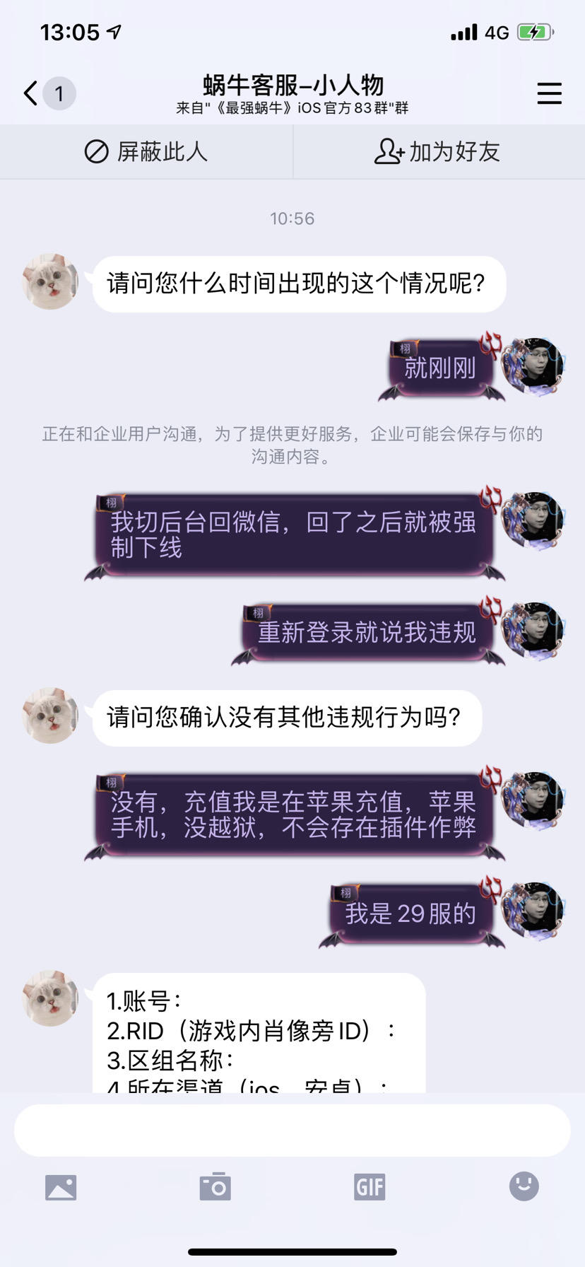 整个事件经过如下,在今天10点多我上游戏的时候,切换了后台换回复微信,然后再次切换回来的时候发现被强制下线,再次登录就说我被封号,后续查询客服,客服说我是发布违规内容,首先第一,本人是氪金玩家,肯定是没氪金大佬氪得多,但几千差不多有上万,第二,本人确定肯定并没有发送违规内容,第三,我已经跟客服反馈过,大约再上周的时候账号被登录过(非本人),知道后已经马上更改密码,开始客服还是说没办法帮到我解封(这