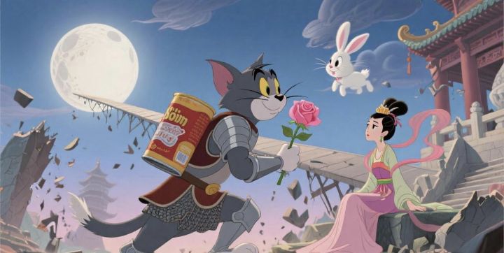 天庭传来急报:广寒宫被不明势力围困,嫦娥仙子危在旦夕!蜗点燃了三根旃檀,伴随着经典的惨叫,凭空出现的并非玄奘法师,而是一只蓝白相间、摔得七荤八素的猫咪。汤姆晃了晃晕乎乎的脑袋,一眼看到了蜗。它立刻整了整脖子上的领结,不知从哪儿掏出一块写字板,上面迅速写出一句话:「包在我身上!」只见汤姆掏出一罐巨大无比的“天上天下唯我独尊”牌猫罐头,用勺子敲了敲。月亮的倒影立刻出现在罐头里,下一秒,一条从南天