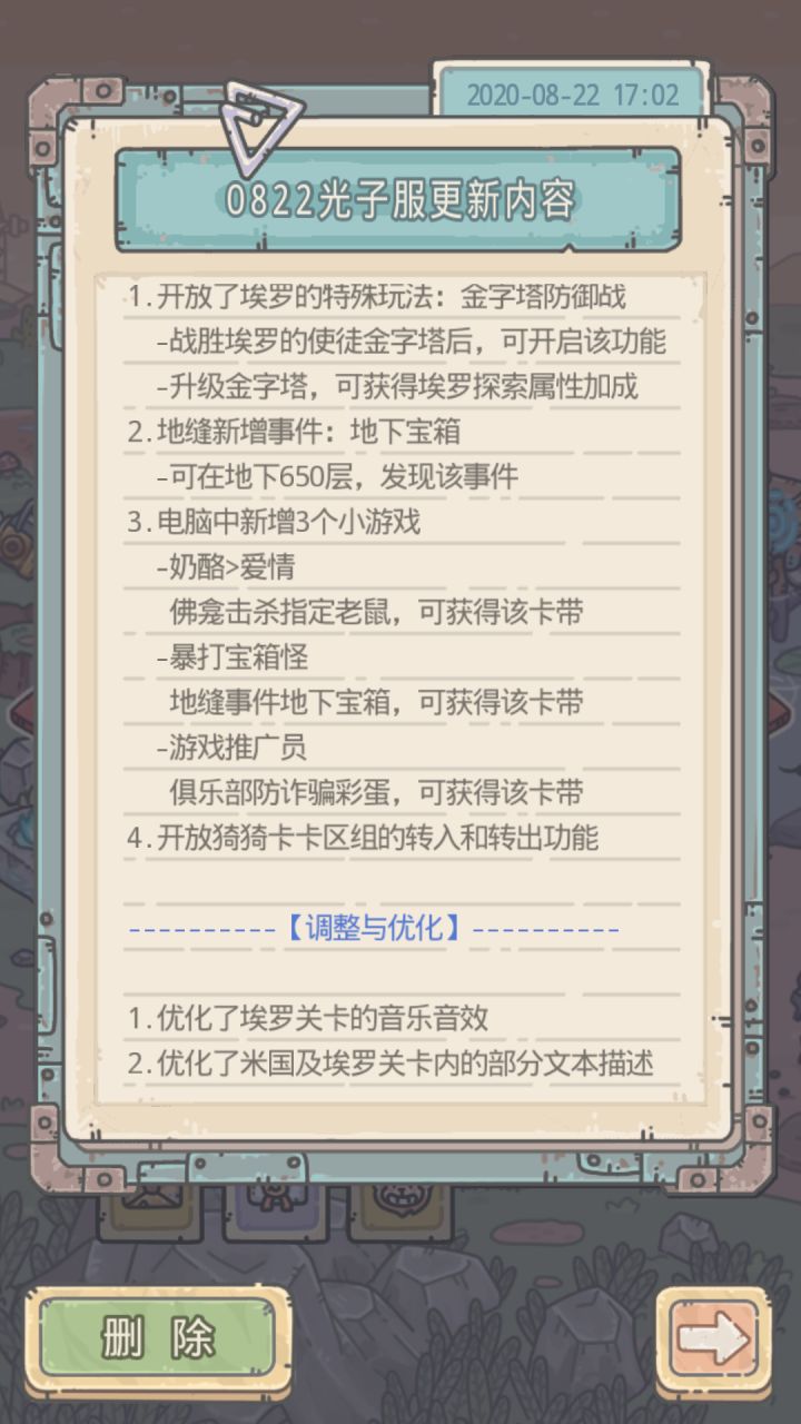 你们楼主是真的菜,恐怕正式服埃罗上线我也过不了贞德了算了不谈这糟心事了,来看22号更新预告吧第一条由于我没开埃罗不知道详情。。(我太菜了实在是抱歉)第二,三两条三个游戏,指定老鼠长啥样等更新了再发图吧但是很显然,包里那些没用卡带(穿越极地,生化危机,吞噬怪这些)还是没用,还是那句话,能不能先把坑填上第四条这个应该是光子服的区所以不多说优化和问题修复貌似没什么说的,好像也就只是把克隆机改回去
