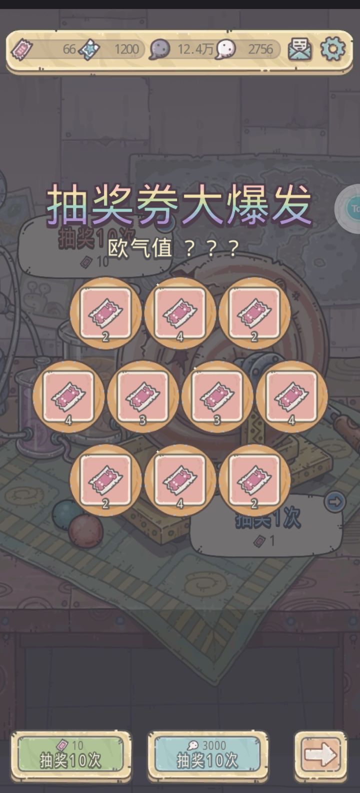 原来我就是潜在的欧皇,这真的震惊到我了。我用了10个抽奖券,抽到了30个抽奖券。我去( ᵒ̴̶̷̤໐ᵒ̴̶̷̤ )我是欧皇欧气值都是问号