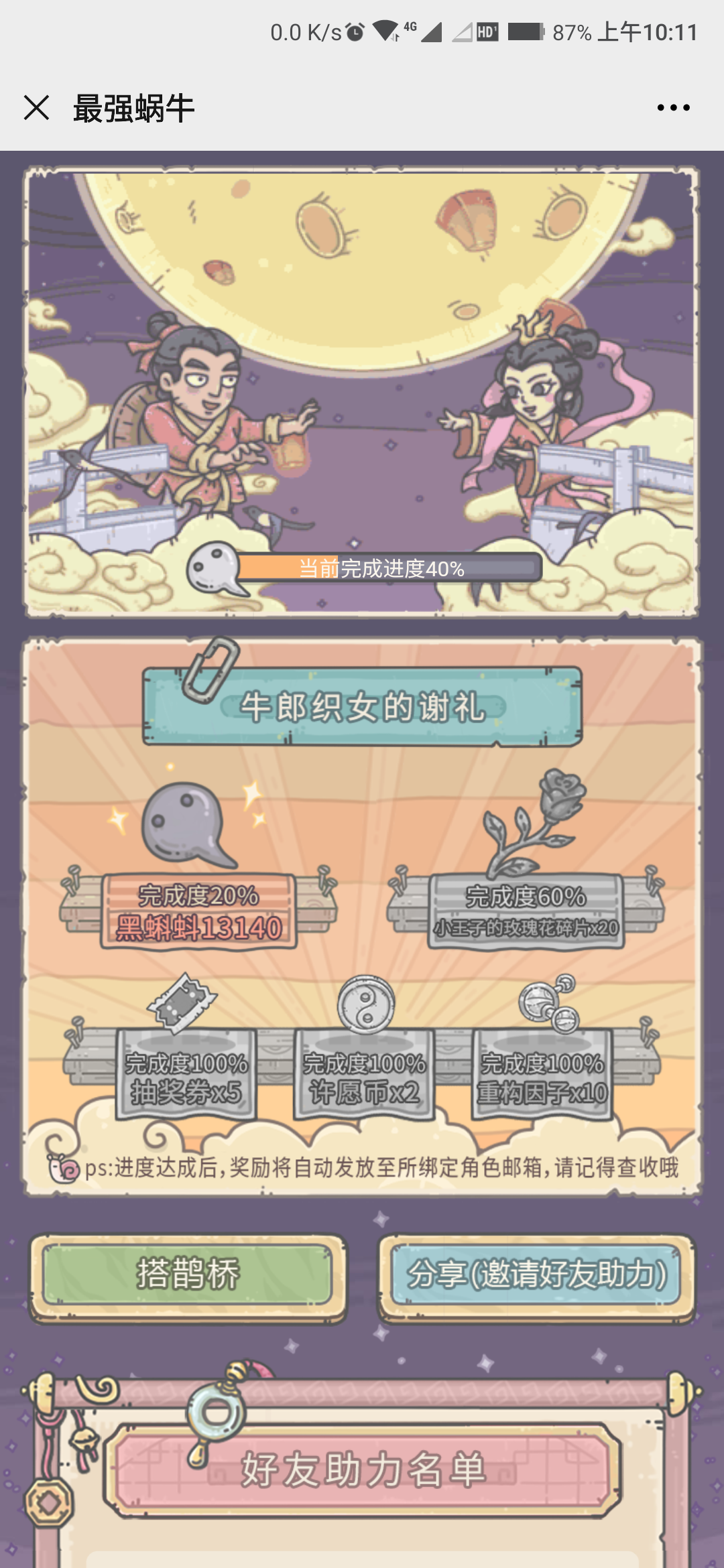 助力鹊桥拿奖励啦https://static.qcplay.com/snail/valentine-day/