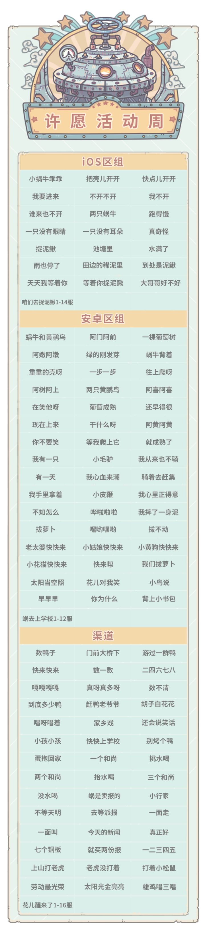 亲爱的蜗爷:我是你们第一喜欢的白蝌蚪!今天为大家带来本周的活动预告~本周五(3月3日)凌晨五点,部分服务器活动将更新为大祈愿之阵,以下是进入周活动的区组注:周一凌晨5点前开服的服务器本周五会进入周活动活动期间,贩售机将出现福利礼包,每天5点刷新,售价1白蝌蚪。内容为:白蝌蚪×20、许愿币×1、奥术灰烬×100活动期间,每使用八卦炉许愿1次,获得1积分。累积对应的活动积分,可获得以上奖励
