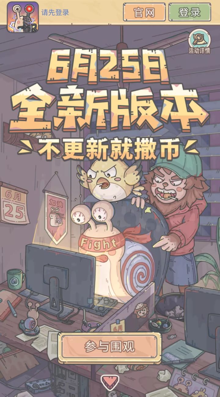 亲爱的蜗爷:我是你们第一喜欢的白蝌蚪。今天帮猴子立一个flag:黄鹂鸟版本6月25日来袭!由于猴子们经常跳票不按时更新,Peter一怒之下决定拿出猴子们的全部奖金做一期活动。若6月25日当天一周年全新版本顺利更新,则完成活动的蜗爷可获得道具奖励及瓜分6万6红包资格。若无法正常更新,则扣除猴子们的奖金、薪金、五险一金用于本次活动奖金,凑足66万现金红包,完成活动的蜗爷即可参与瓜分。活动时