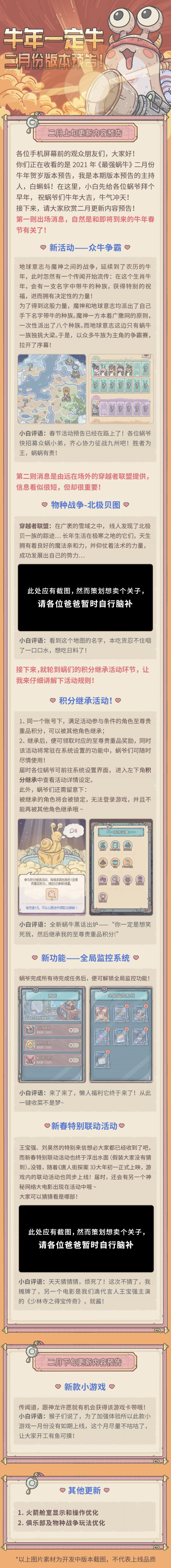 亲爱的蜗爷:我是你们第一喜欢的白蝌蚪。眼瞅着离春节放假没几天了,猴子们每天都在兢兢业业地加班,只为了让蜗爷们能在春节开开心心玩蜗牛!小白亲自前往探(jian)望(du)头发掉得没剩几根的猴子们,送去蜗爷们的爱心慰问(着急催更)!这不,优秀的侦察兵小白又成功套出了二月份的版本预告!以上,就是这次爆料的全部内容了~喜欢的蜗爷一定记得评论点赞转发三连哦!小白祝大家【新年欧气爆棚】