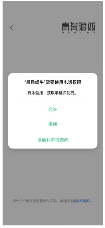 亲爱的蜗爷:以下为在《最强蜗牛》游戏过程中,需要向玩家获取的手机权限,玩家即使拒绝授予以下权限,也不会影响正常游戏。1、【获取手机信息权限】用于一键登录游戏功能,将在游戏启动时询问是否同意获取权限,若不同意,将不能使用一键登录功能登录游戏,玩家可选择其他方式登录游戏。2、【存储权限】用于在游戏内联系客服时向客服发送相册图片,将在游戏内联系客服发送图片时询问是否同意获取权限,若不同意,将无法