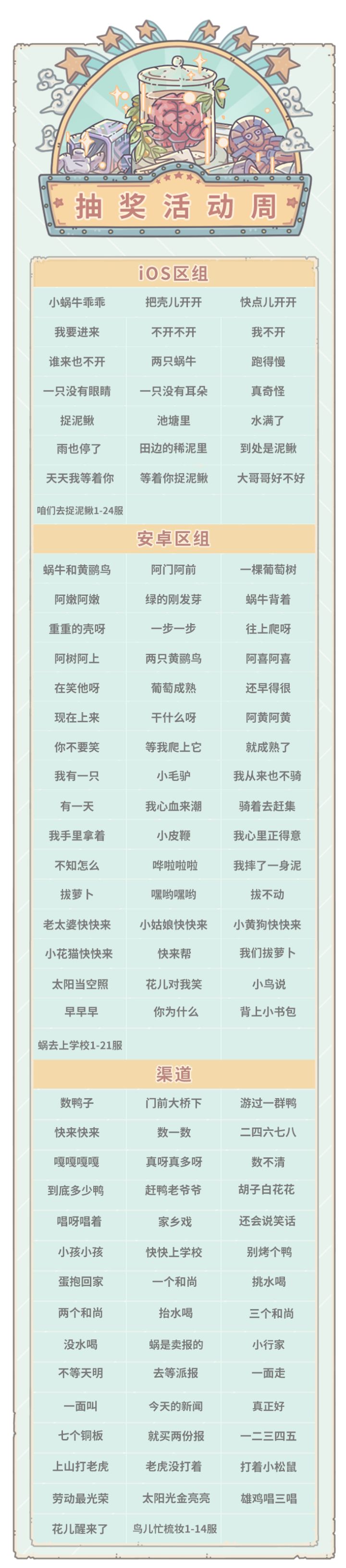 亲爱的蜗爷:我是你们第一喜欢的白蝌蚪!接下来为大家播报本周活动预告!本周五(4月7日)凌晨五点,部分服务器活动将更新为抽奖嘉年华,以下是进入周活动的区组。注:周一凌晨5点前开服的服务器本周五会进入周活动活动期间,每天会在贩售机中出现福利礼包,每天5点刷新,售价1白蝌蚪。内容为:白蝌蚪×20、抽奖券×3、嘉年华气球×100活动期间,每进行1次抽奖,可获得1个积分。累积对应的活动积分,可