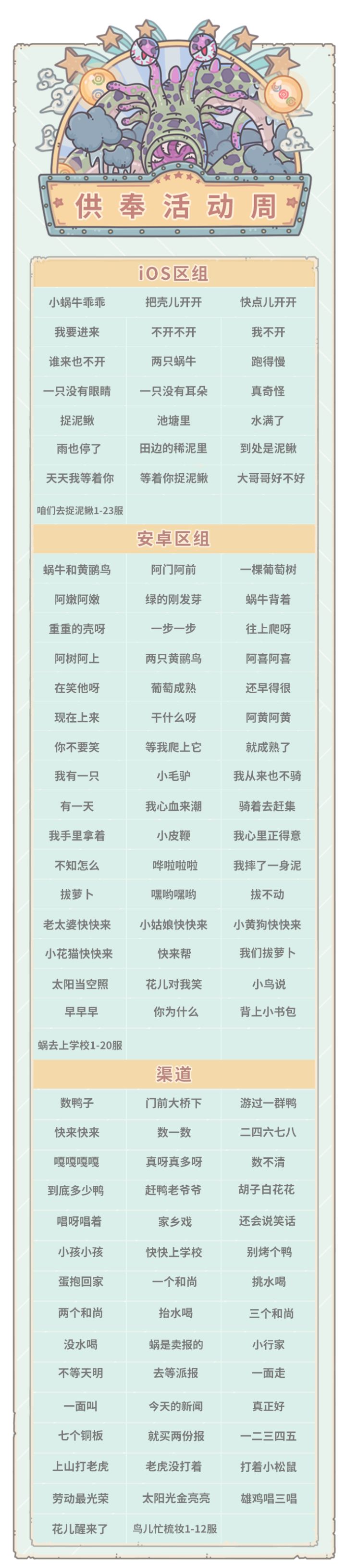 亲爱的蜗爷:我是你们第一喜欢的白蝌蚪!接下来为大家播报本周活动预告!本周五(4月21日)凌晨五点,部分服务器活动将更新为神坛秘仪,以下是进入周活动的区组。注:周一凌晨5点前开服的服务器本周五会进入周活动活动期间,贩售机将出现福利礼包,每天5点刷新,售价1白蝌蚪。内容为:供奉加速×30分钟、开发者的灵魂×1、灵能水晶×100活动期间,每次领取供奉奖励,根据祭品原始的供奉时间,获得活动积