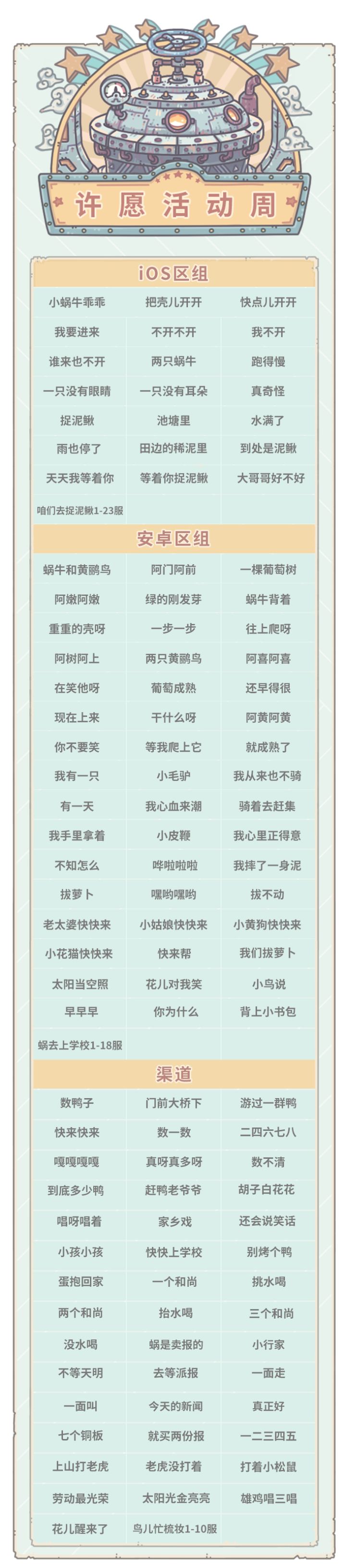 亲爱的蜗爷:我是你们第一喜欢的白蝌蚪!今天为大家带来本周的活动预告~本周五(4月14日)凌晨五点,部分服务器活动将更新为大祈愿之阵,以下是进入周活动的区组。(周一凌晨5点前开服的服务器本周五会进入周活动)活动期间,贩售机将出现福利礼包,每天5点刷新,售价1白蝌蚪。内容为:白蝌蚪×20、许愿币×1、奥术灰烬×100活动期间,每使用八卦炉许愿1次,获得1积分。累积对应的活动积分,可获得以