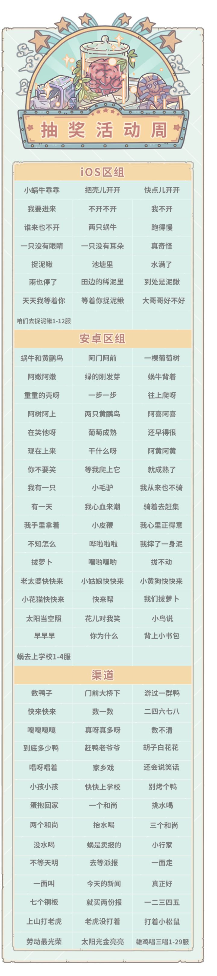 亲爱的蜗爷:我是你们第一喜欢的白蝌蚪!接下来为大家播报本周活动预告!本周五2月3日凌晨五点,部分服务器活动将更新为抽奖嘉年华,以下是进入周活动的区组。(周一凌晨5点前开服的服务器本周五会进入周活动活动期间,每天会在贩售机中出现福利礼包,每天5点刷新,售价1白蝌蚪。内容为:白蝌蚪×20、抽奖券×3、嘉年华气球×100活动期间,每进行1次抽奖,可获得1个积分。累积对应的活动积分,可获得以