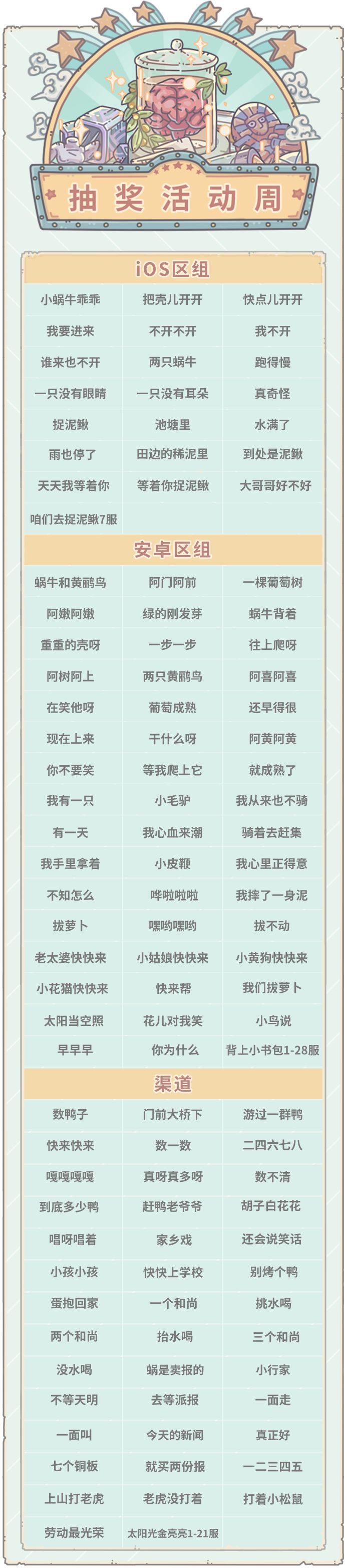 亲爱的蜗爷:我是你们第一喜欢的白蝌蚪!本周我们开启了新一期公益合作!护梦前行限定贵重品闪亮登场~本次护梦前行活动总共将分为三期活动,今天将为大家带来第一期的活动预告!本周五(12月2日)凌晨五点,部分服务器活动将更新为抽奖嘉年华,以下是进入周活动的区组。(周一凌晨5点前开服的服务器本周五会进入周活动)活动期间,每天会在贩售机中出现福利礼包,每天5点刷新,售价1白蝌蚪。内容为:白蝌蚪×20