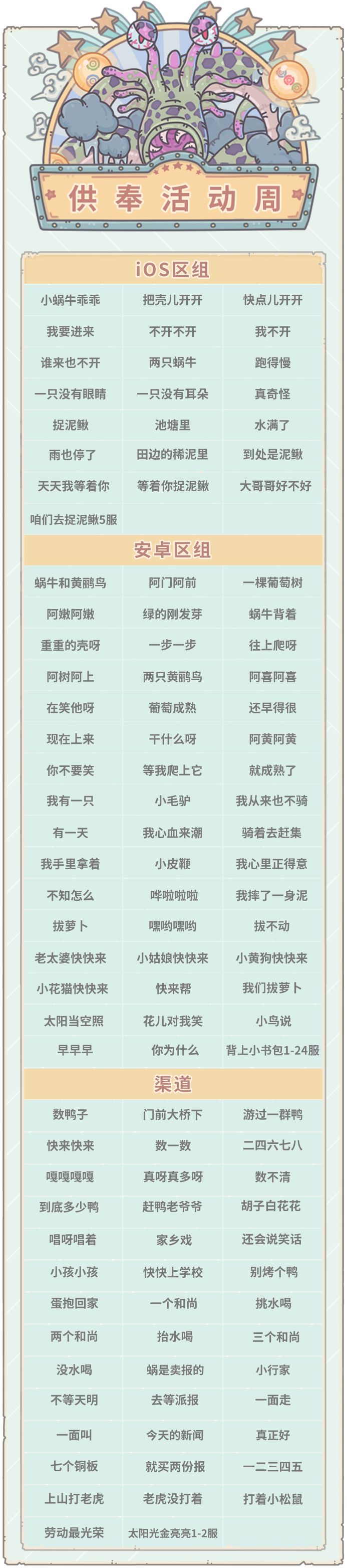 亲爱的蜗爷:我是你们第一喜欢的白蝌蚪!今天为大家带来本周的活动预告~本周五(10月28日)凌晨五点,部分服务器活动将更新为大祈愿之阵,以下是进入周活动的区组。(周一凌晨5点前开服的服务器本周五会进入周活动)活动期间,贩售机将出现福利礼包,每天5点刷新,售价1白蝌蚪。内容为:白蝌蚪×20、许愿币×1、奥术灰烬×100活动期间,每使用八卦炉许愿1次,获得1积分。累积对应的活动积分,可获得以