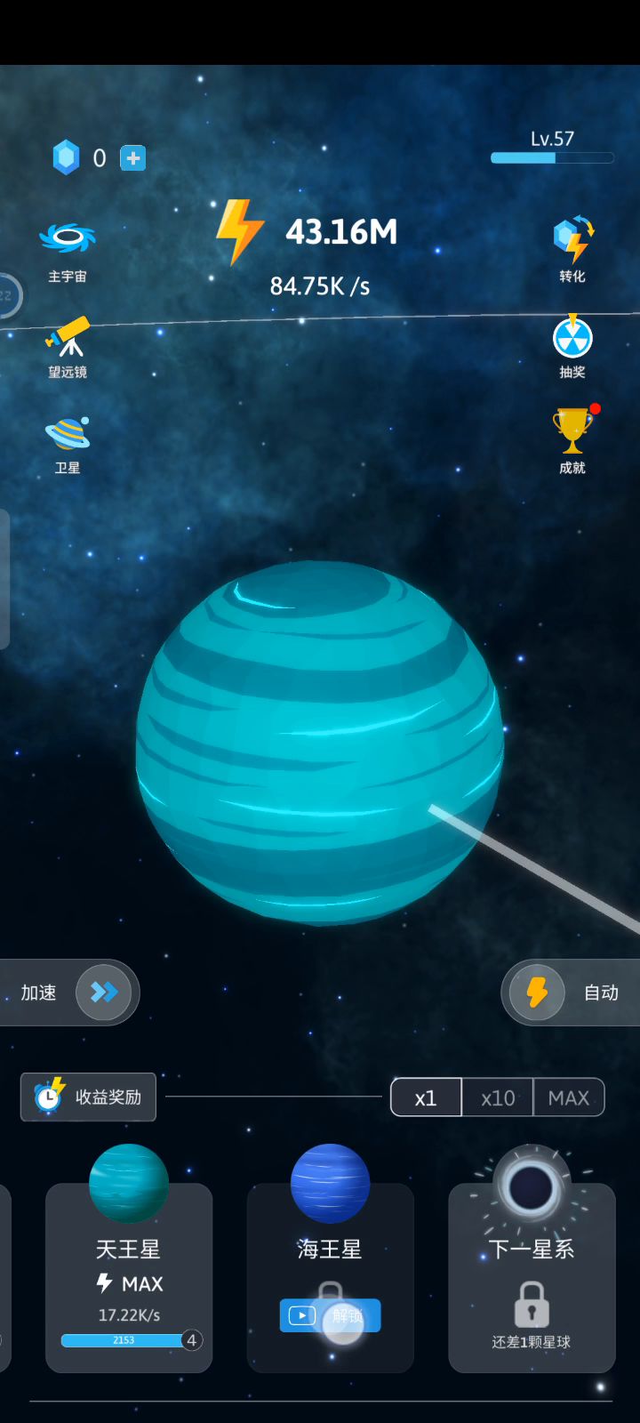 这个……不知道为什么太阳系的最后一个行星海王星解锁不了,他说要看广告视频才能解锁,但是连那个广告视频都界面都点不开,在领取奖励那里也是,希望制作方可以注意一下这个问题,还有就是要升级的话就要一直一直点,手指都要点废了,这个也是可以改进一下哒。