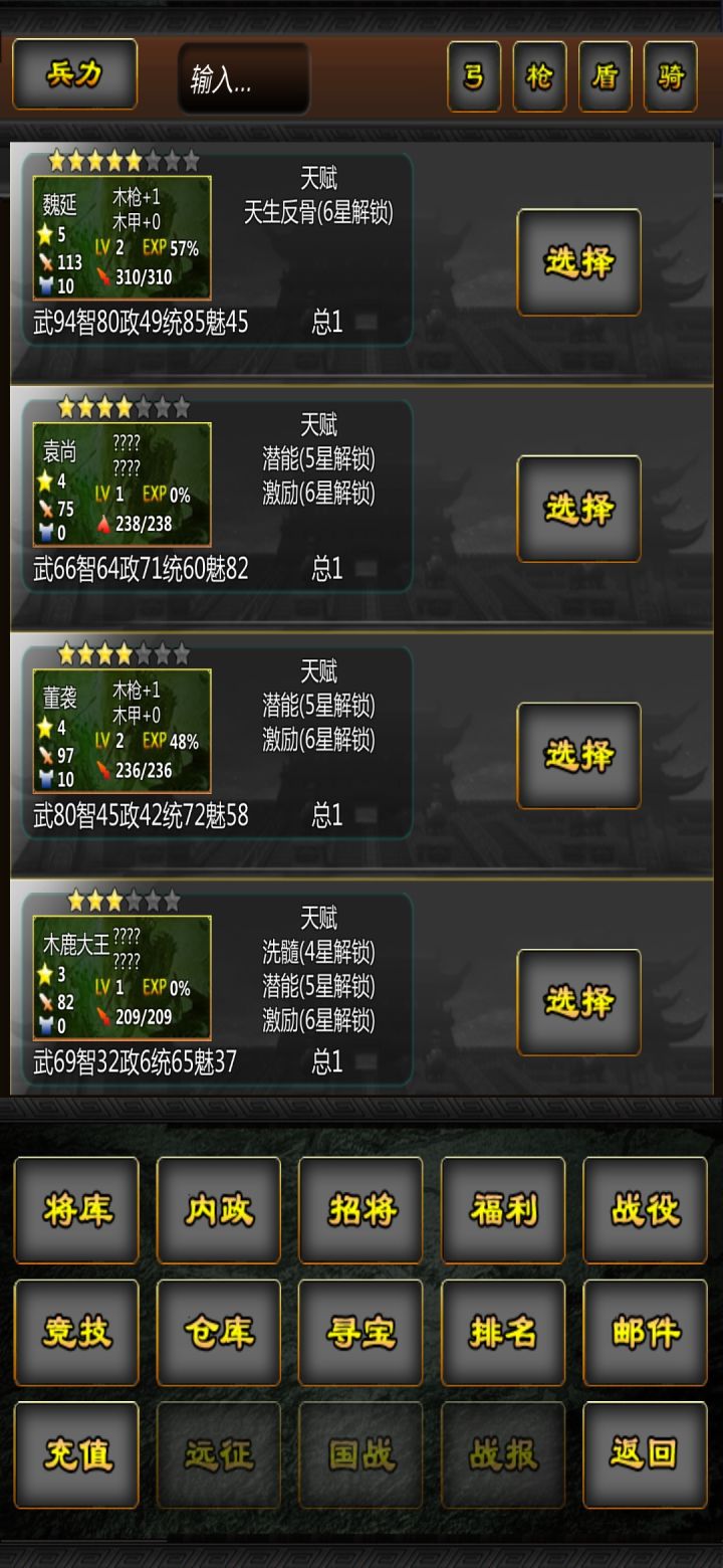总体来说游戏非常不错,就喜欢这种抓将的感觉,提几点建议吧1.目前设置不合理的地方:武力值不知道有什么用,目前只知道魅力和内政的作用,但是武力和智力两个三国最凸显的数值感觉没有发挥应有的作用2.值得期待的内容:希望可以增加立绘,不一定要有动画,但只要有立绘就真的有三国内味道了