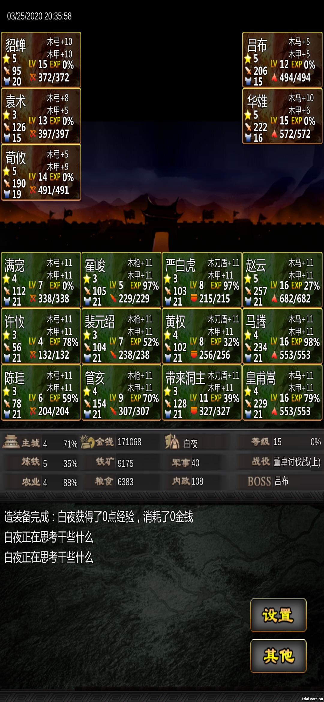 武将后期太多无用的,又不能升级,都在将库里睡觉!建议自动安排主城内政,或者开放多线程攻打关卡(第二线程从头开始爆率降低,招降降低)!既然是三国游戏,只有打仗没有内政总感觉缺少安全感!个人觉得还是安排内政(可以设置治安,民心,开发商业,剿匪,水利,道路,环境,灾害等……)来升级,还有就是主公等级升级太快,武将最高才到40多,主公就升到60多了(如果无限等级,当我没说)!还有就是出战武将和未出战武将