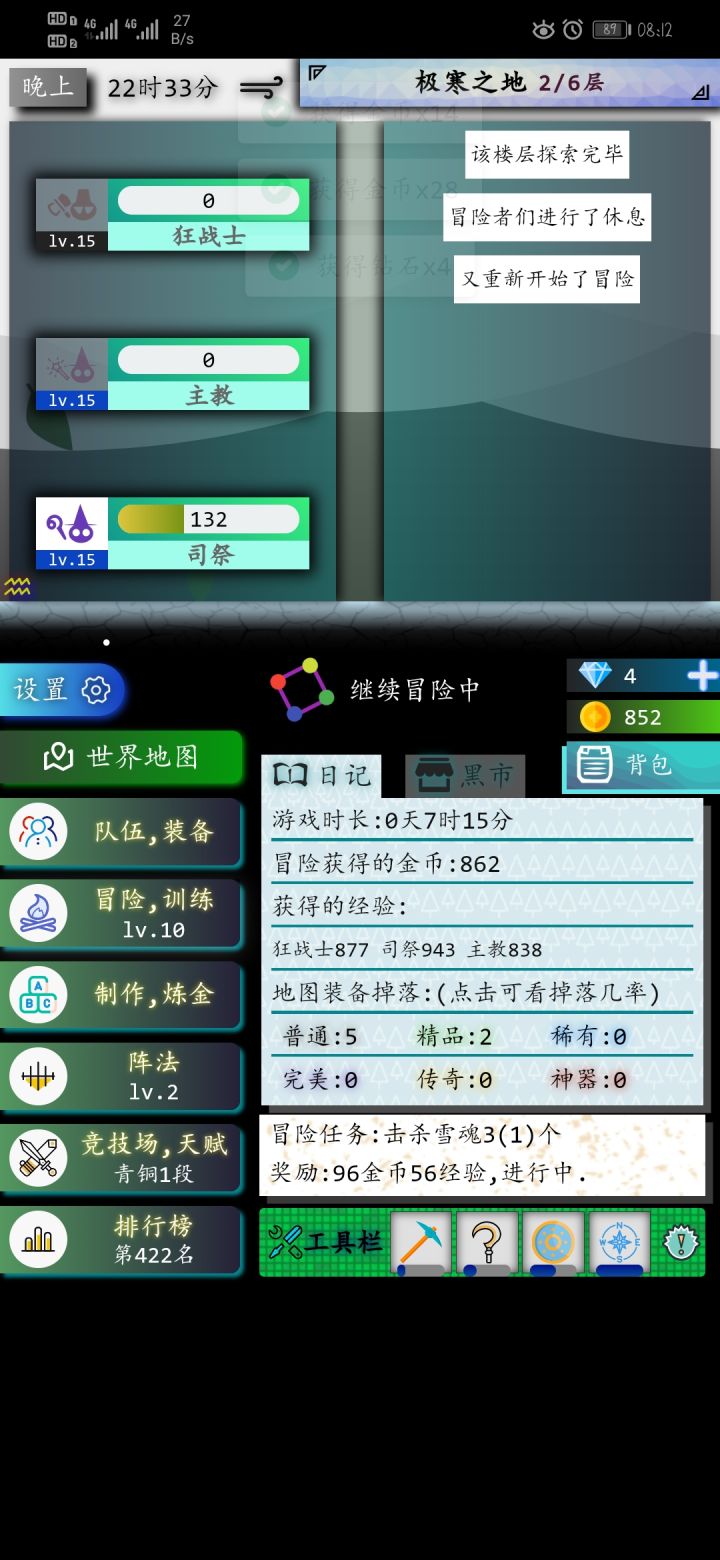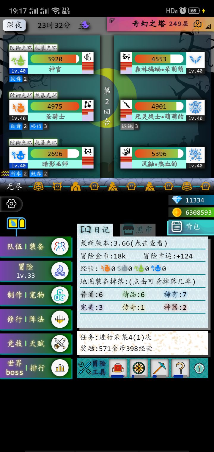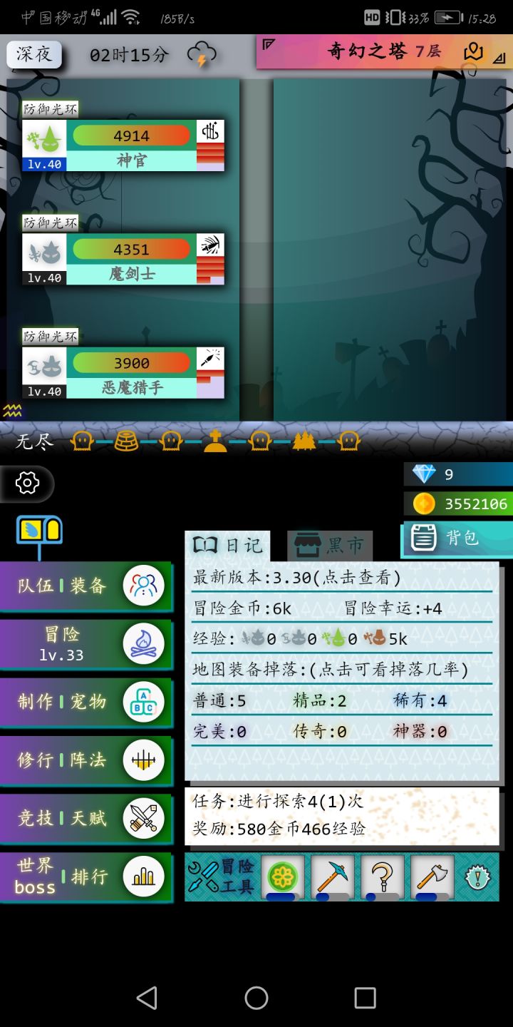 最近奇幻之塔来了大波萌新有很多人没搞明白所以先写个简洁的攻略吧。先上基础的面板图做些介绍第一队伍上面延伸的小翅膀图标是邮箱、日常奖励和月卡奖励,每天可以零点重置可以领取三百钻石,月卡还能多150钻石。第二队伍装备就不用多说了我们直接讲冒险采集、采矿、采伐可以加采集效率和采集物品的数量,没点两下单数是采集效率加一双数采集数量加一,到后期想获取材料就必须把等级点上去探索每一点增加八卦掉率